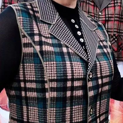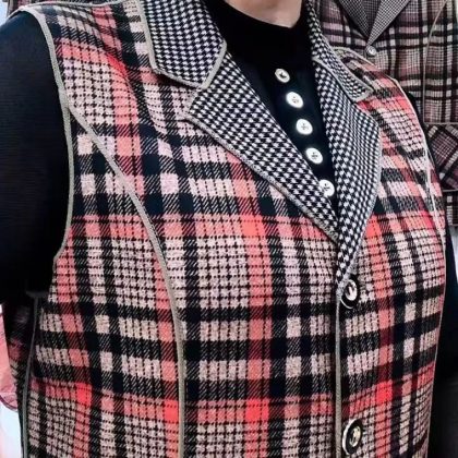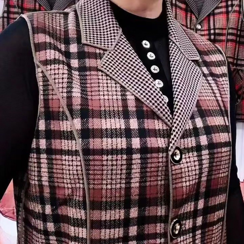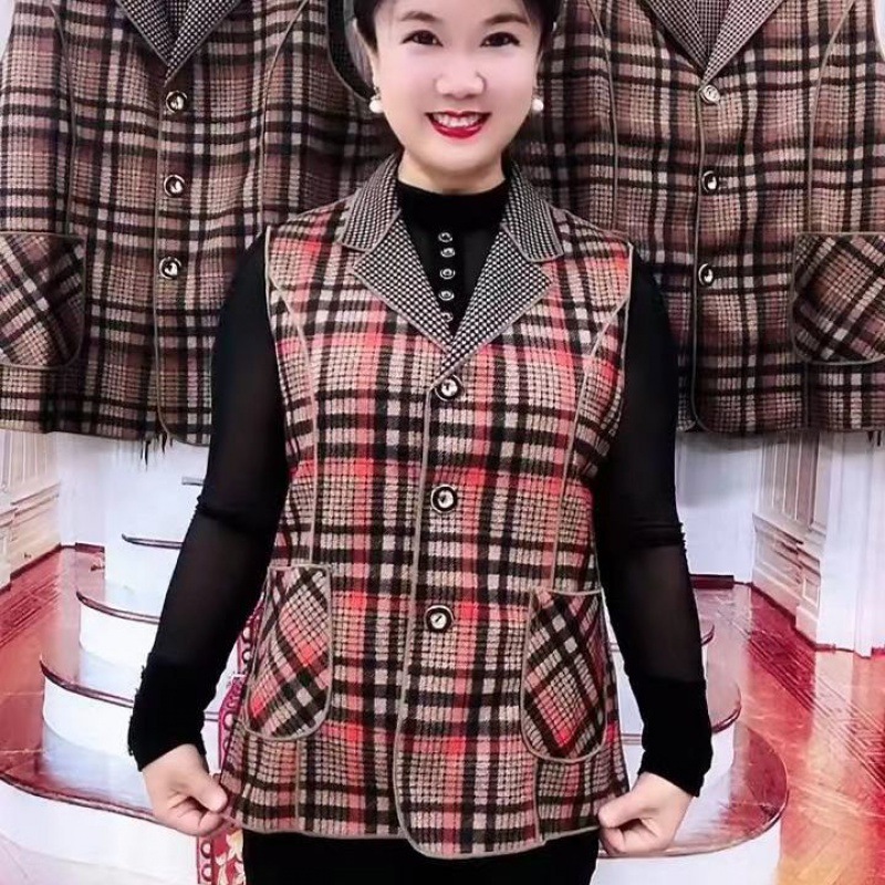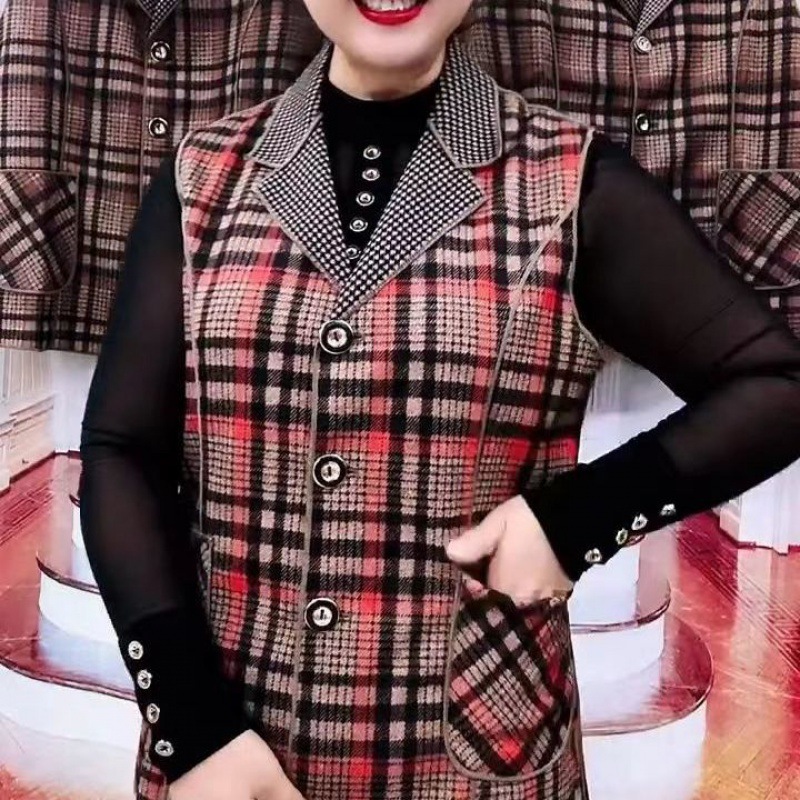 Stylish Mom Short Plaid Vest Coat Autumn New Chinese Style Thin Outer Top with Pocket for Women