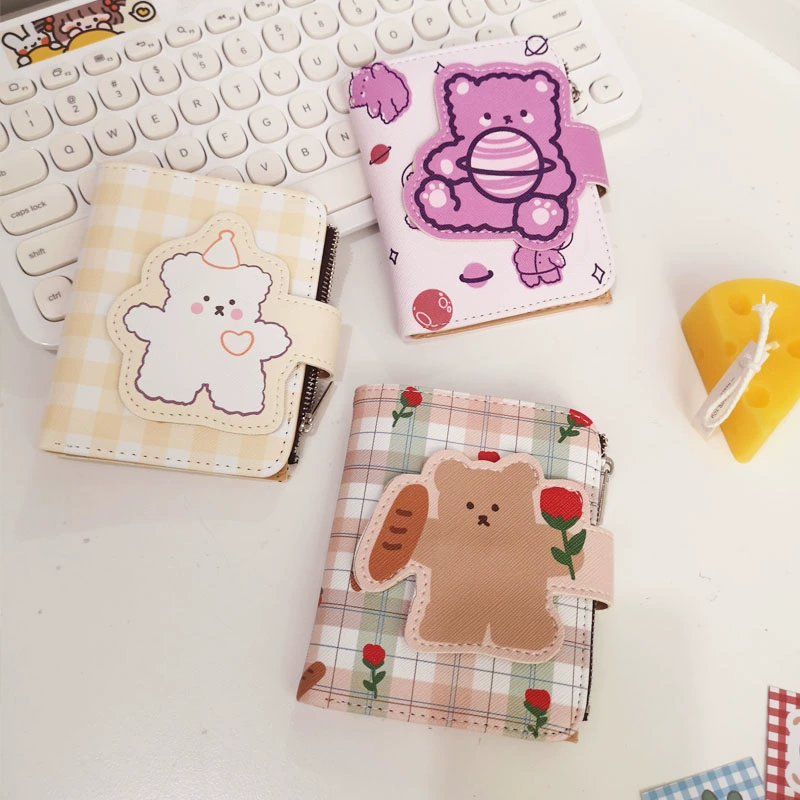 Su Zaizai's same ins style cartoon bear plaid cute short coin purse female pu card bag with zipper
