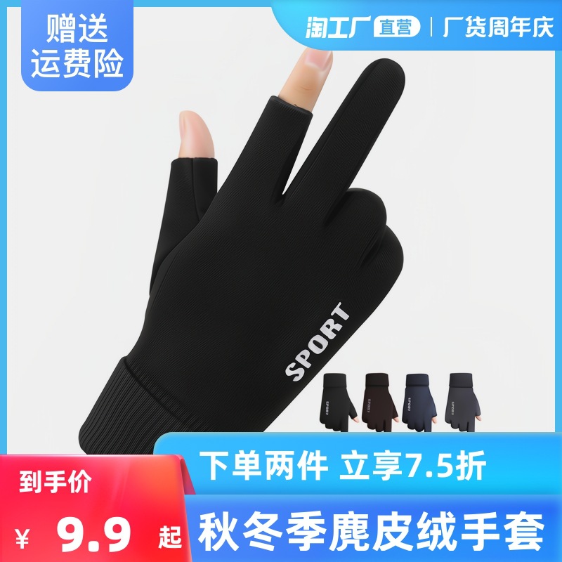Suede gloves men's autumn and winter cycling warm fleece-lined touch screen winter cycling leak two finger gloves female half finger