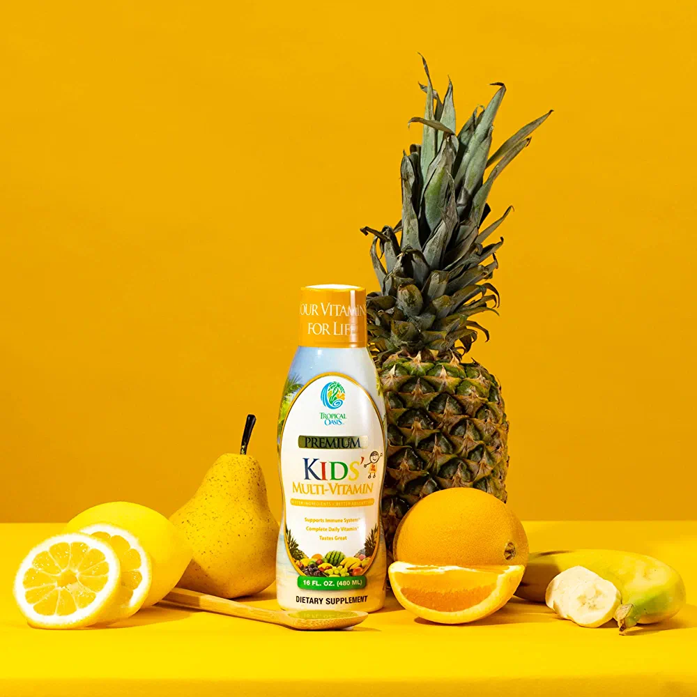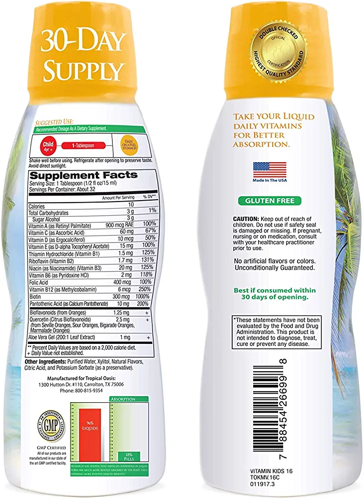 Introducing our delicious liquid multivitamin for kids, perfect for ages 4 and up! Say goodbye to the struggle of getting your kids to take their daily vitamins with our great-tasting formula. Each dose contains 100% of the essential daily nutrients your child needs to support a healthy immune system.