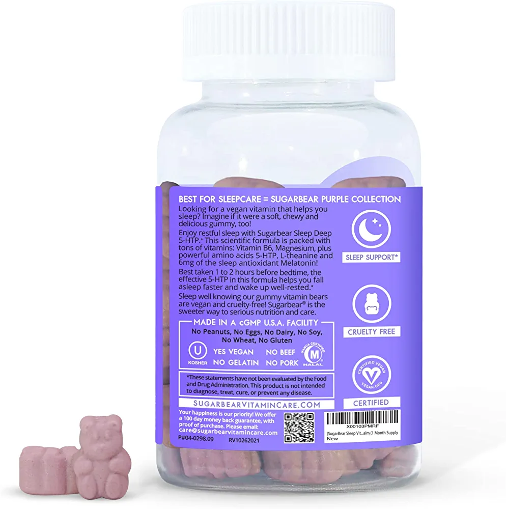 | nameOriginal | Sugarbear Sleep Aid Gummies for Adults with Melatonin 6mg, Magnesium, L-Theanine, 5 HTP, Vitamin B6, Valerian Root, Lemon Balm, Passionflower – Halal Chewable Sleep Supplement, Sleep Vitamins, 60 Ct |