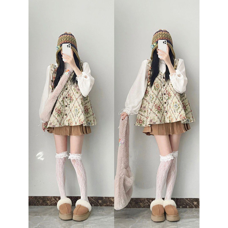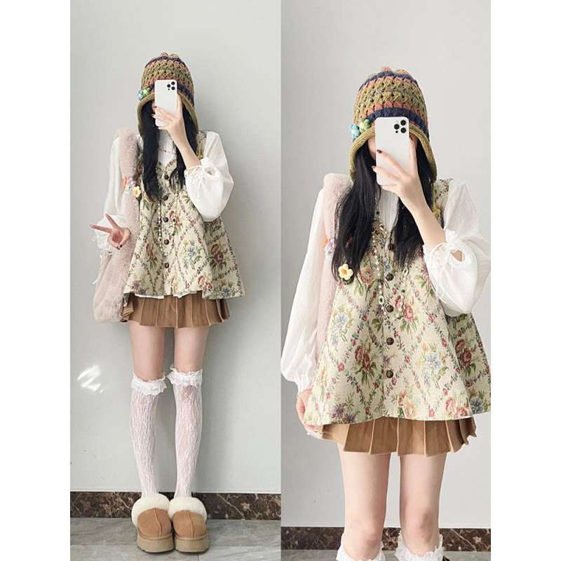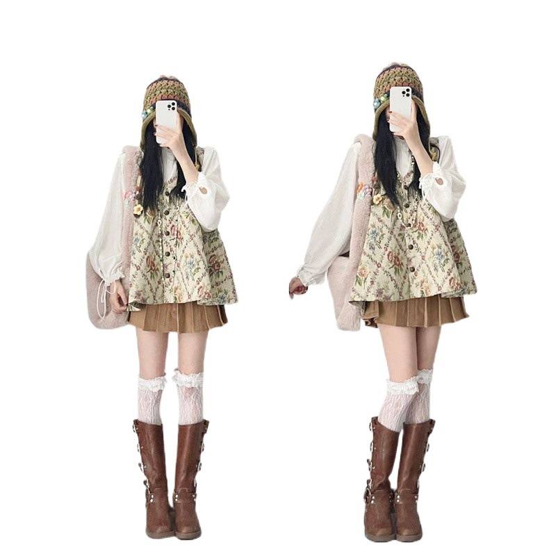 | nameOriginal | suit Women 2023 Autumn New Vintage Gentle Floral Vest Long Sleeve Shirt Half-length Skirt Three-piece Set |