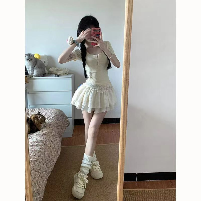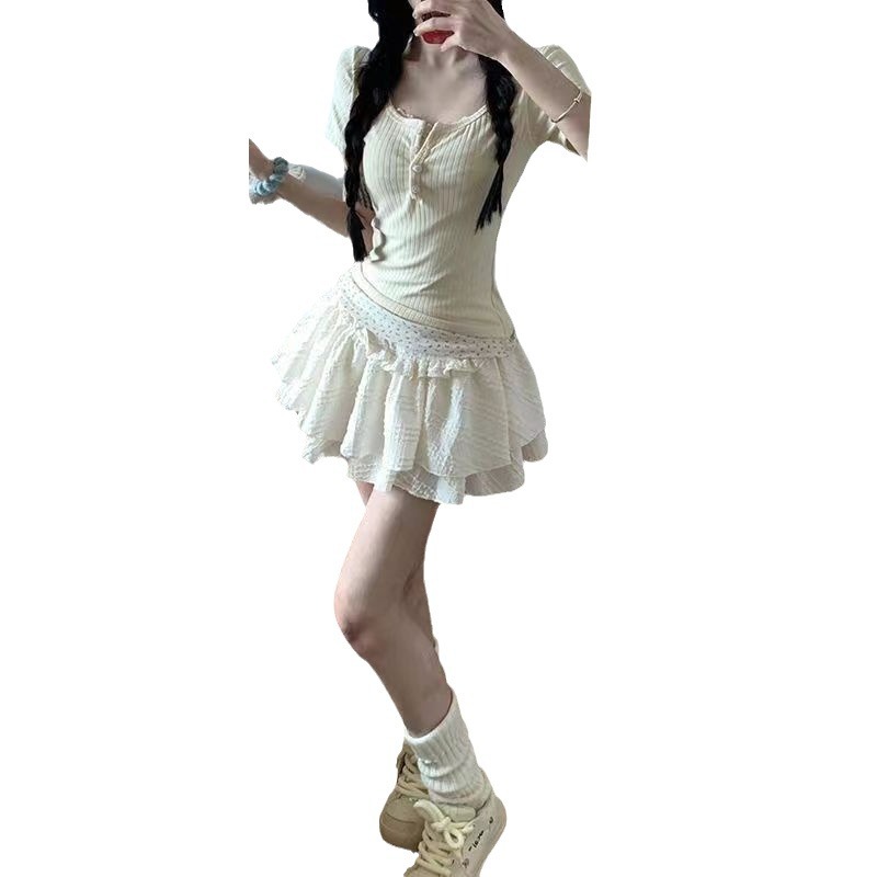 suit Women's Tight Waist Summer New Sweet Cool Spice Girl Fake Two-piece Floral Patchwork Short-sleeved T-shirt Skirt Two-piece Set