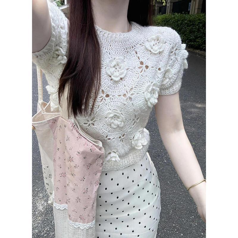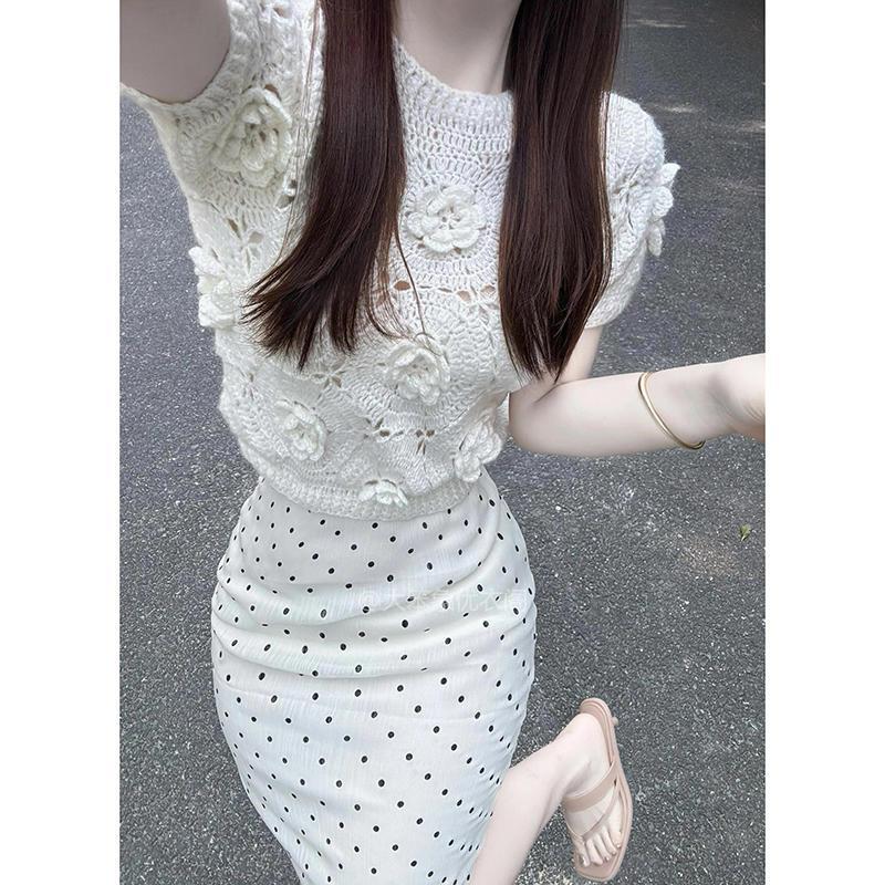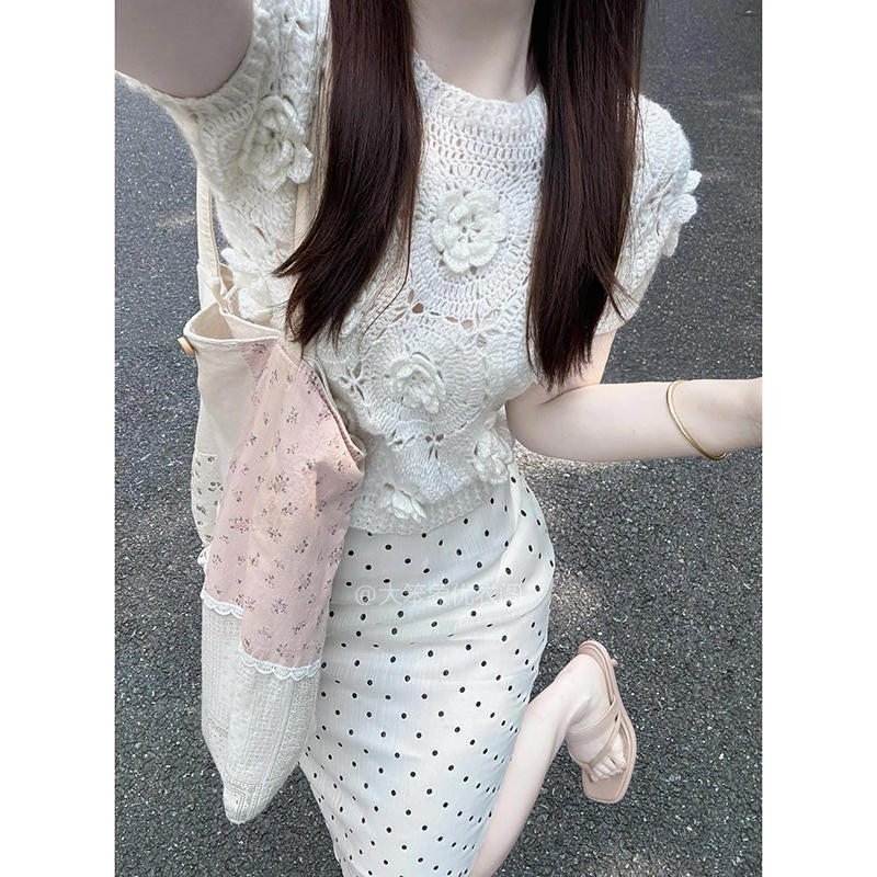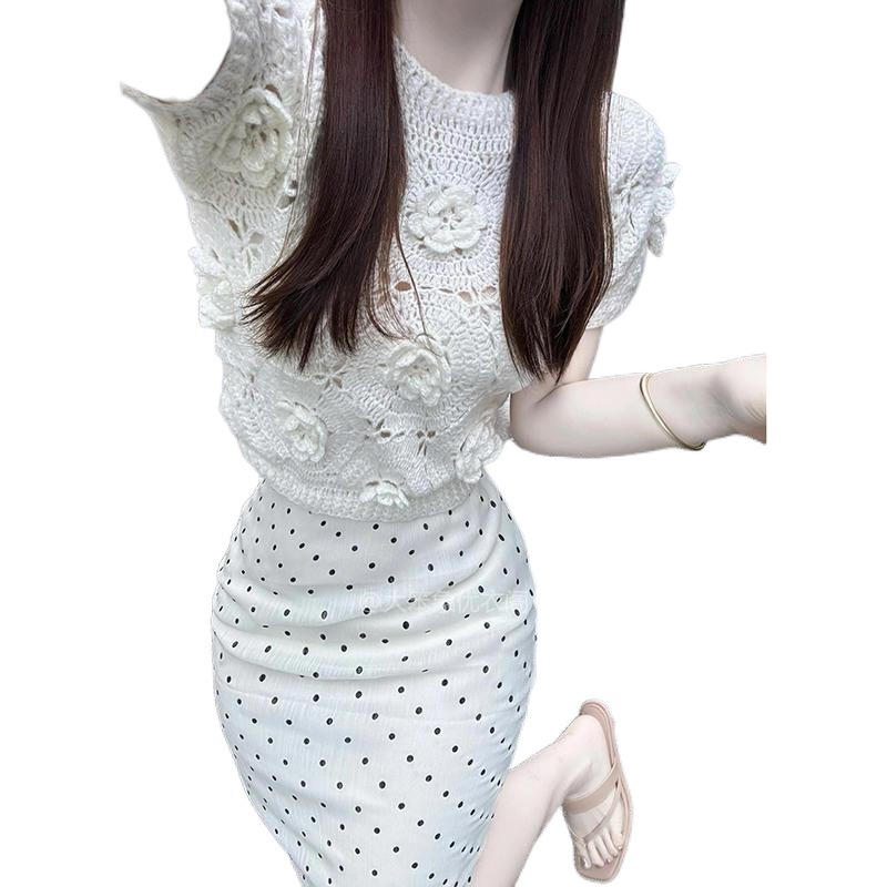 | nameOriginal | suit Women's Unique Super Nice Niche Design Sense Foreign-style Hollow Flower Knitted Top Wave Dot Hip Skirt |