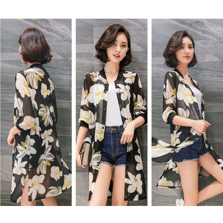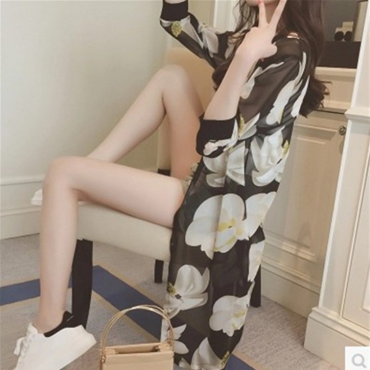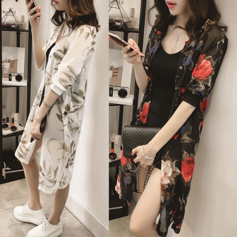 Summer 2022 New Arrival Korean Style Chiffon Printed Small Stand Collar Large Size Mid-length Seven-sleeve Sunscreen Shirt Trench Coat for Women