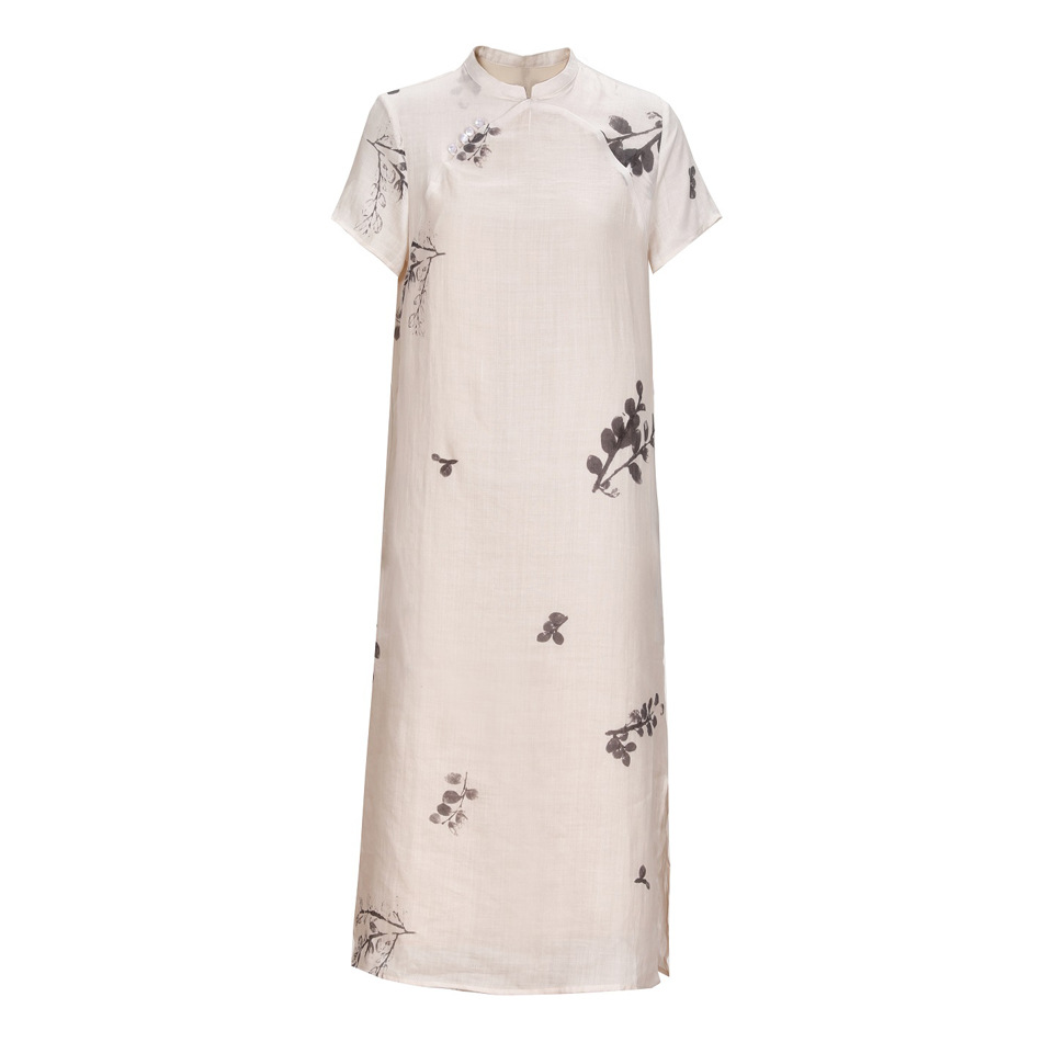 Summer 2022 New Arrival Ramie Printed Women's Clothing Travel Artistic Retro Set Collar Short-Sleeved Long Dress for Women