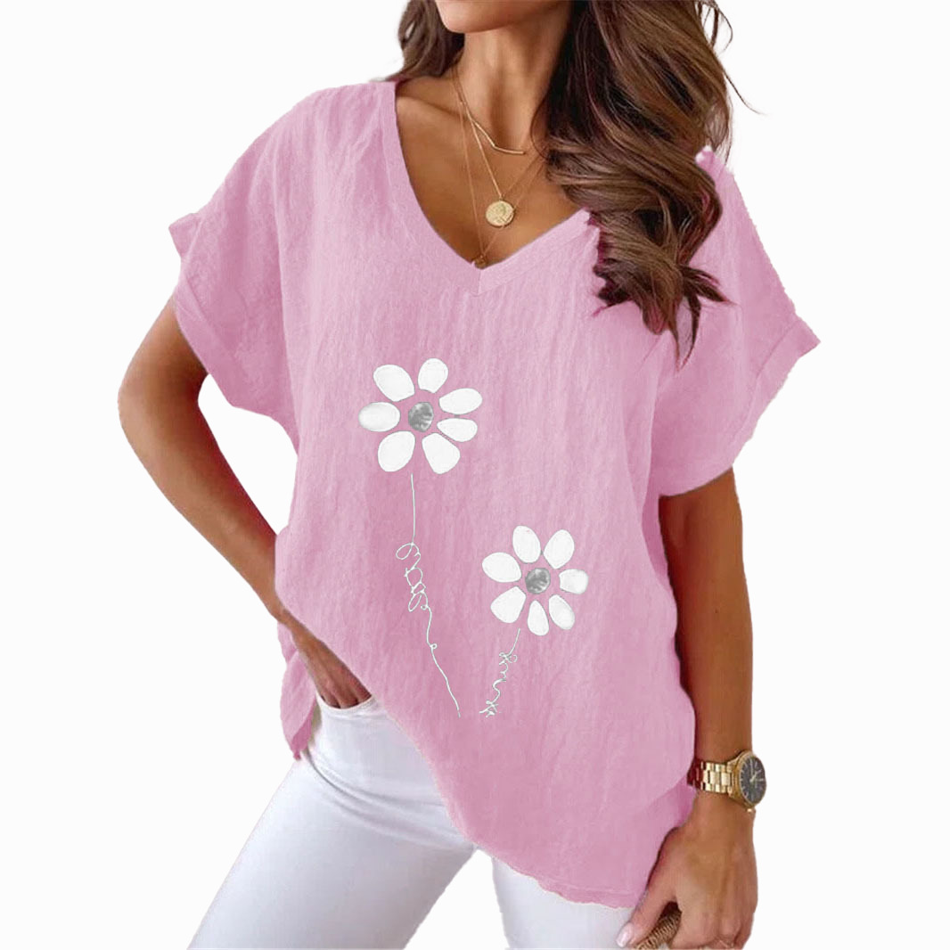 Summer 2023 Cross-border European and American plus size Women’s Clothing Amazon Printed V-neck Cotton Linen Casual Bat Short-sleeved T-shirt Women