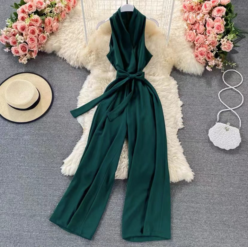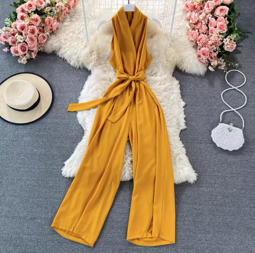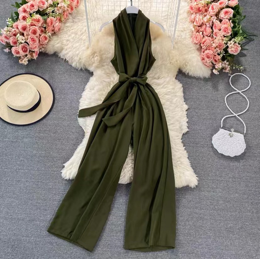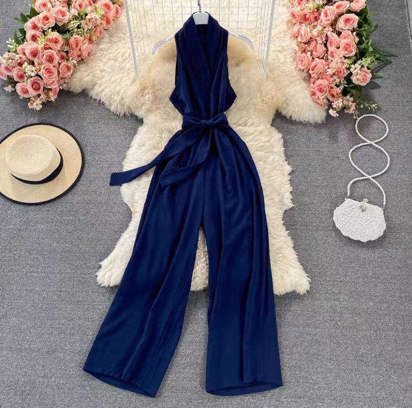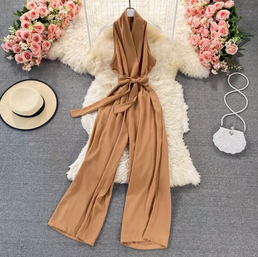 | nameOriginal | Summer 2023 fashionable elegant V-neck sleeveless halter jumpsuit tight waist lace-up slimming wide leg trousers jumpsuit for women |