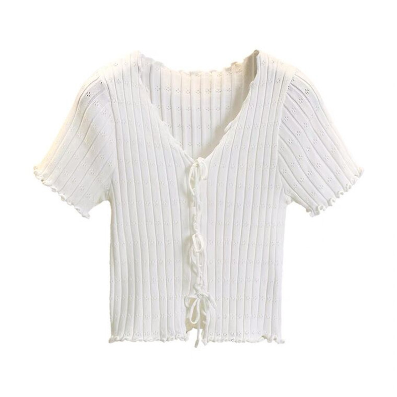 Summer 2023 New Women’s Clothing Slim-fit Slimming Wood-ear Sweater V-neck Lace-up Clavicle Short-sleeved T-shirt Top Trendy
