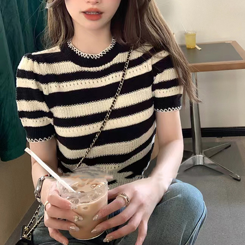 | nameOriginal | Summer 2024 French Round Neck Striped Hollow Knitted T-shirt Design Sense Simple Niche Chic Long Sleeve Top Trendy |