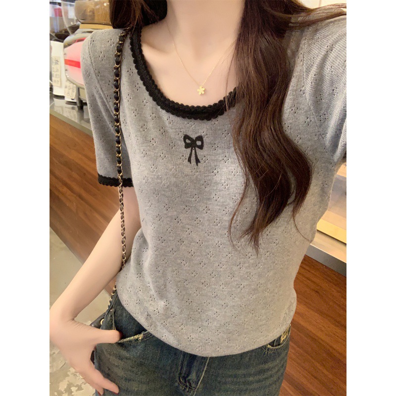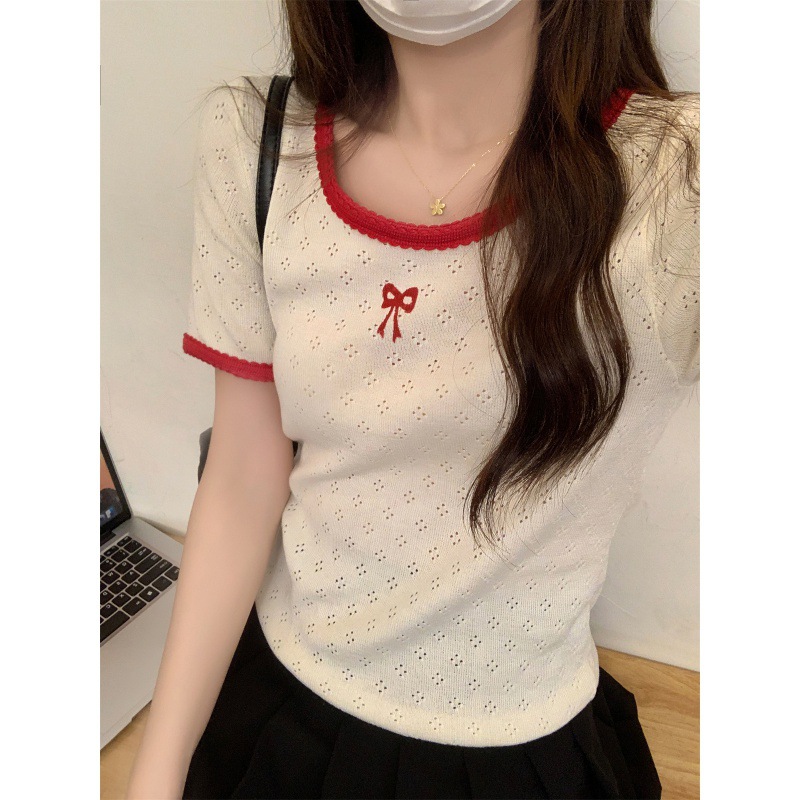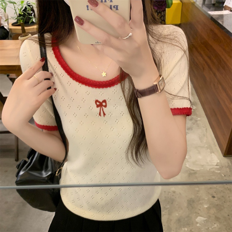 | nameOriginal | Summer 2024 Korean Style Elegant Round Neck Contrast Hollow Bow Knitted Shirt Short Sleeve Top |