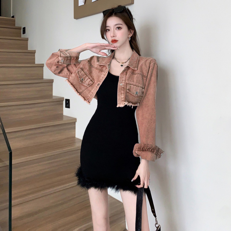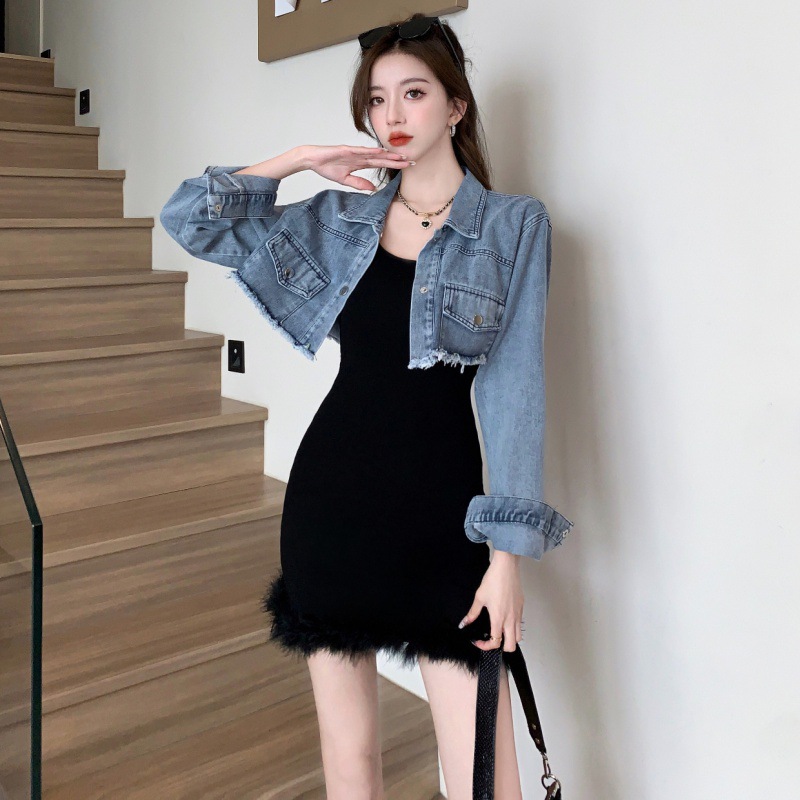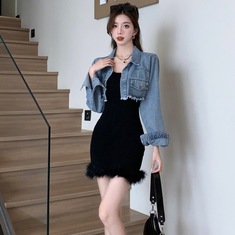 | nameOriginal | Summer 2024 New American Retro Spice Girls Super Short Denim Coat Mao Mao Sling Base dress Two-piece Set |