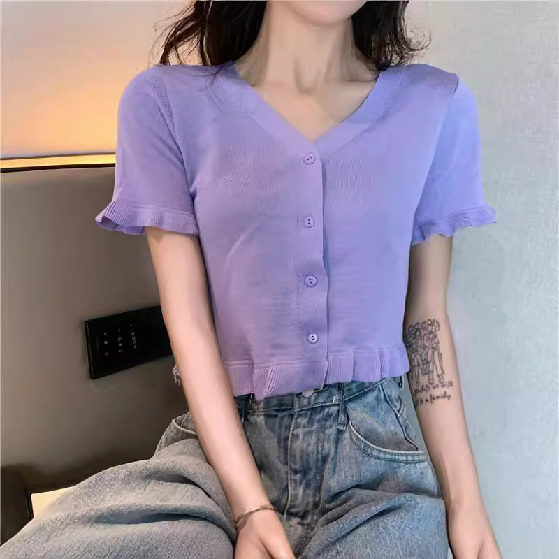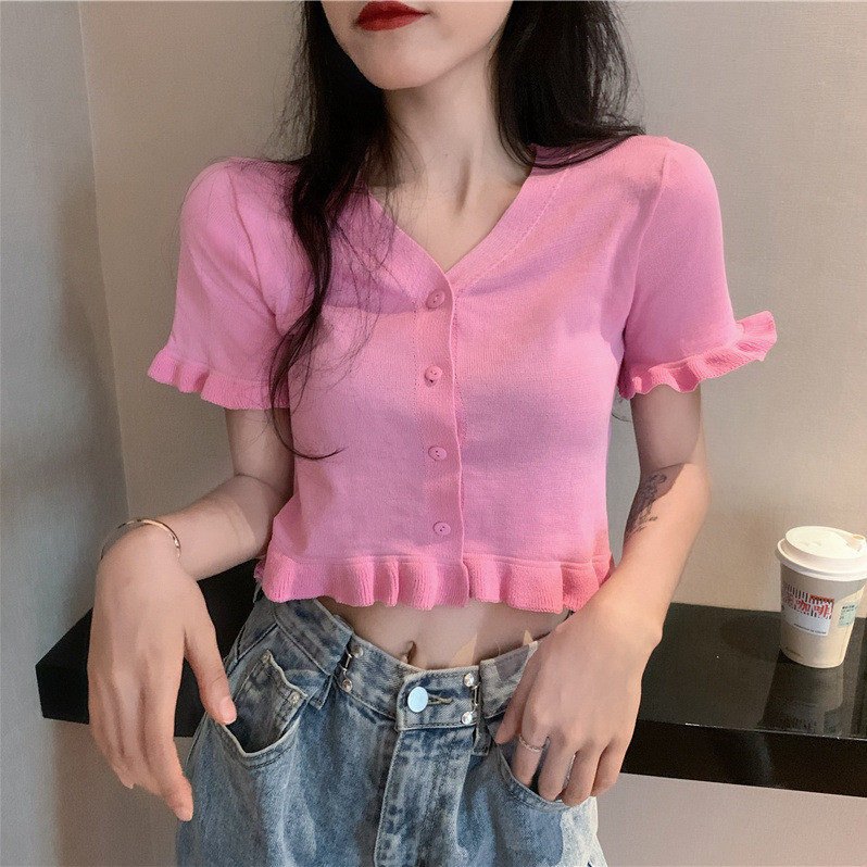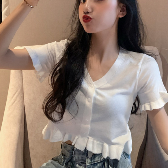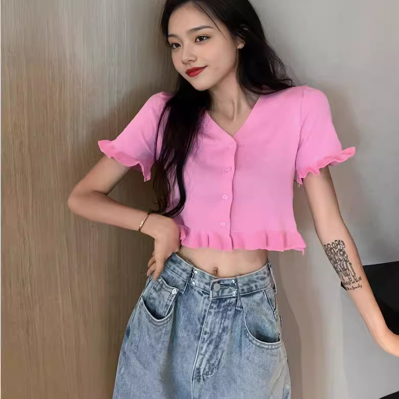 | nameOriginal | Summer 2024 New Arrival All-Match Solid Color Sweet Spice Girl Short Ear-Edge Short-Sleeved Short Top |
