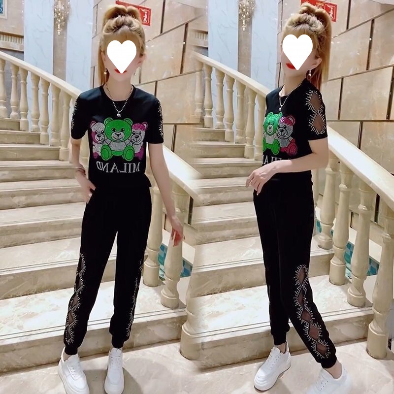 | nameOriginal | Summer 2024 new casual sports suit women's heavy industry Diamond-embedded short-sleeved sweatpants loose slimming two-piece suit fashion |