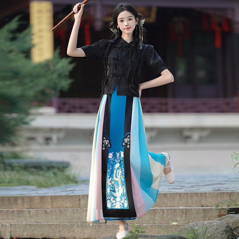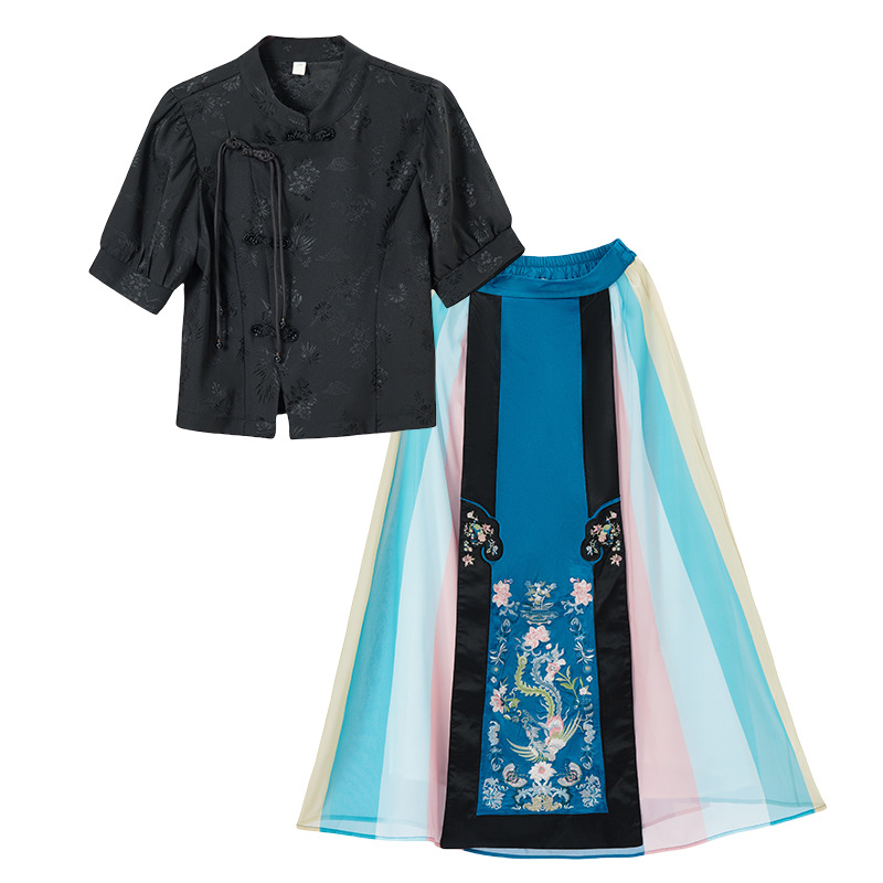 | nameOriginal | Summer 2024 New Chinese Jacquard Collar National Style Buckle Short-sleeved Top with Color-matching Embroidered Skirt Two-piece Set |
