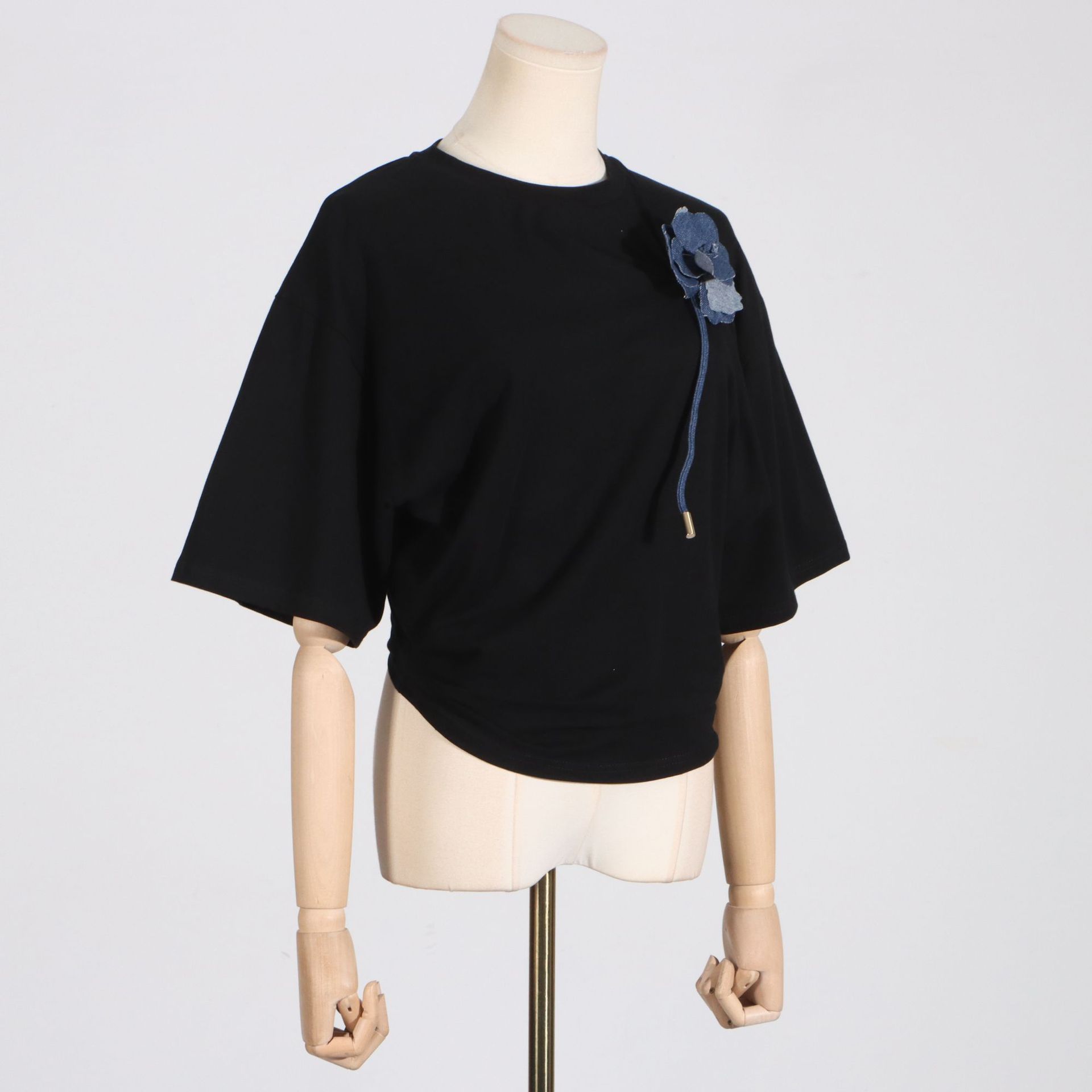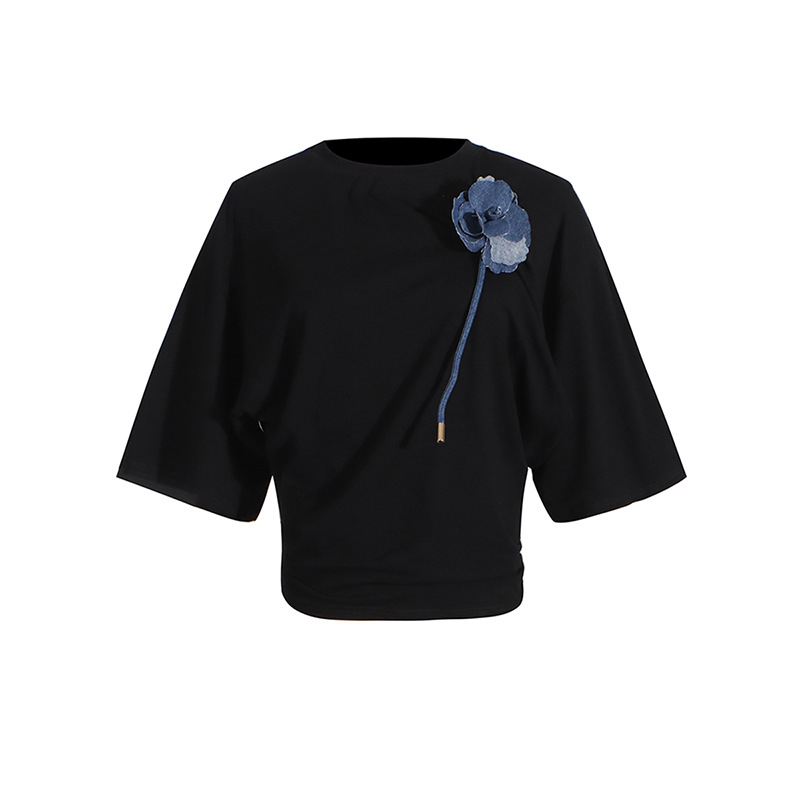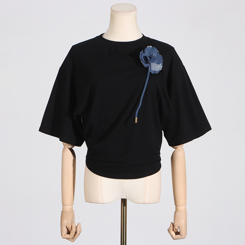 | nameOriginal | Summer 2024 New Fashion Design Sense Three-dimensional Denim Rose Simple Decorative Round Neck Pleated T-shirt Top for Women |