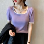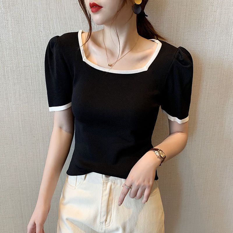 | nameOriginal | Summer 2024 New Ice Silk Knitted Square Collarbone T-shirt Short-sleeved Women's Loose Chic Puff Sleeve French Top |