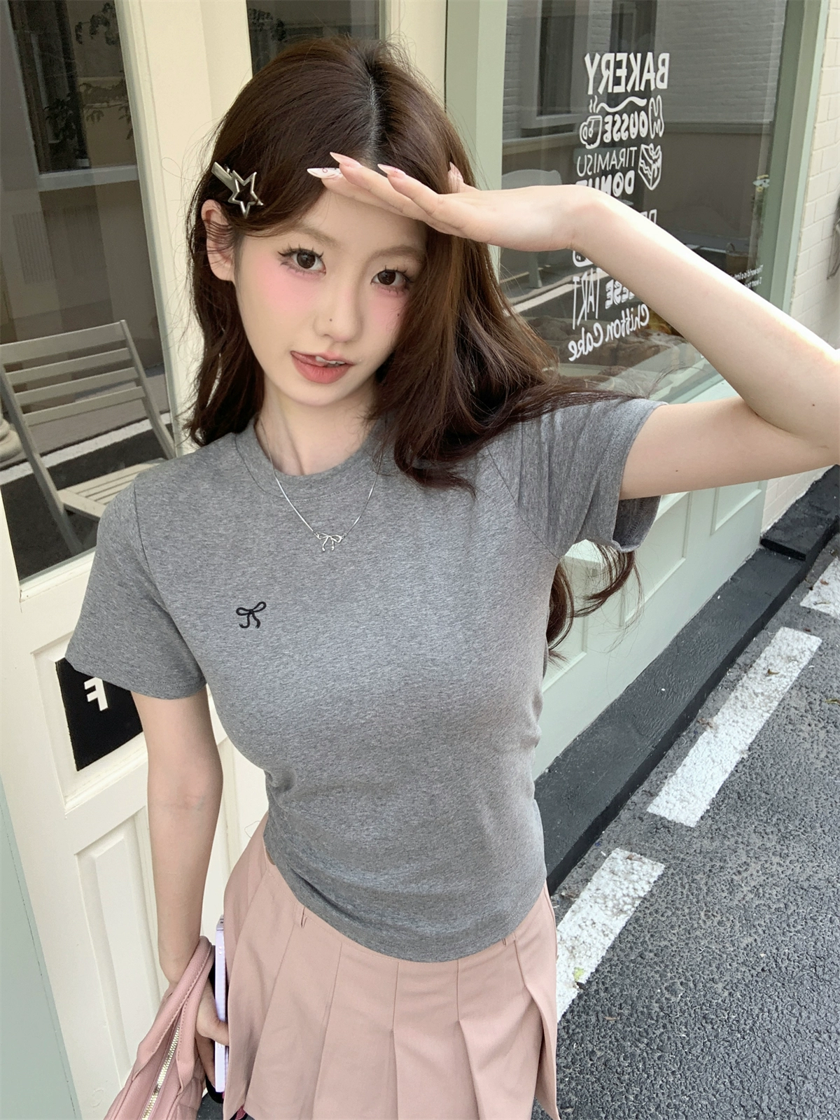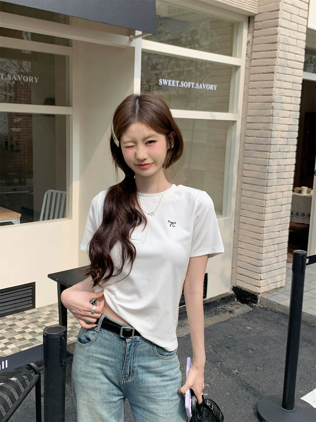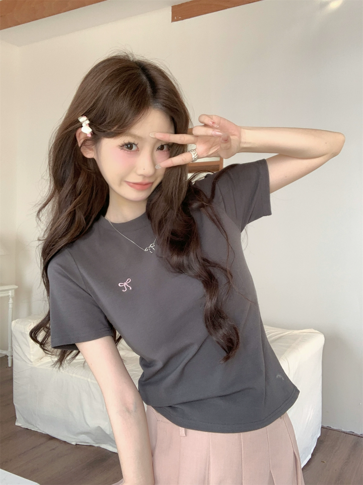 Summer 2024 new style slimming pullover pure cotton top Korean style round neck bow embroidered short-sleeved T-shirt for women