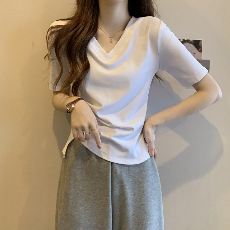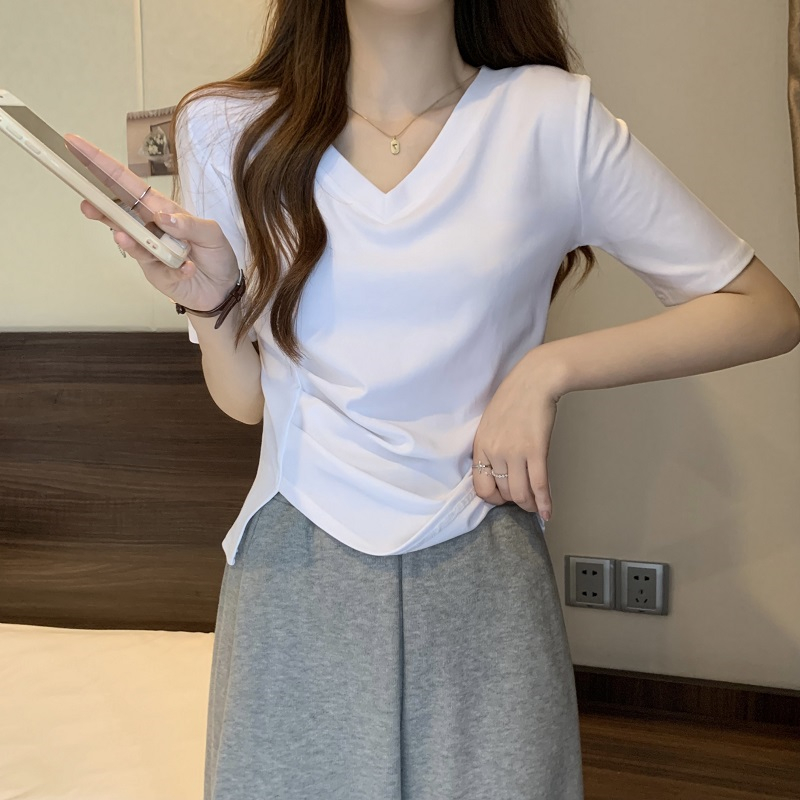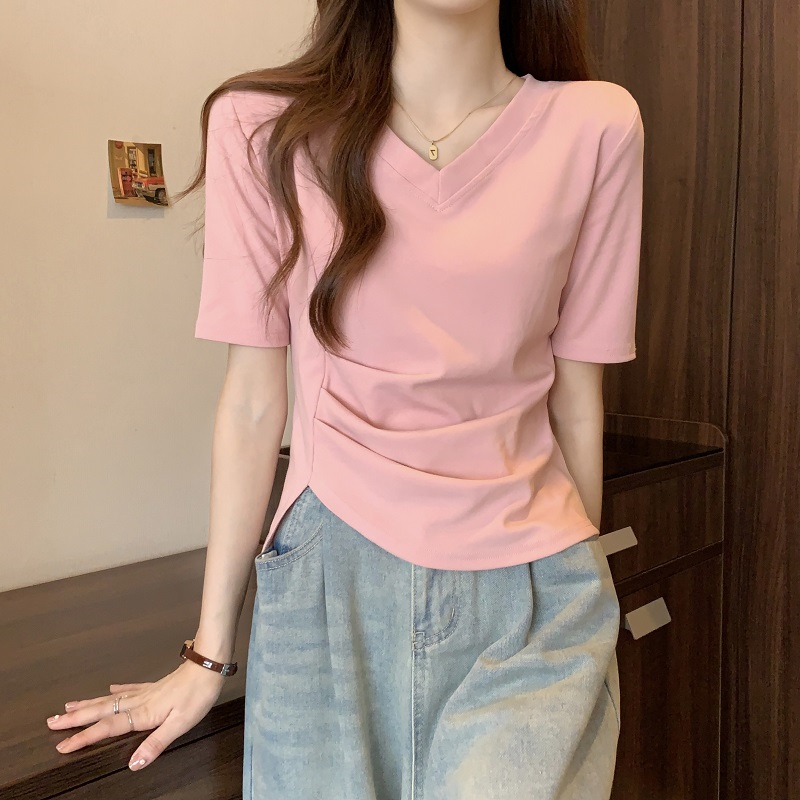 | nameOriginal | Summer 2024 New V-neck Slim-fit Short Spice Girls Shoulder T-shirt Women's Short-sleeved Design Sense Niche Top |
