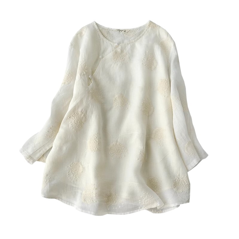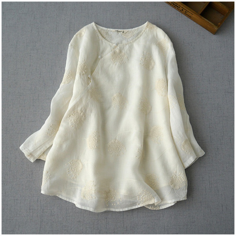 Summer 3306 Women’s Fresh Style Ramie Embroidered Seven-Sleeve Shirt Mori Style Sweet Slant Pullover Top Small Shirt