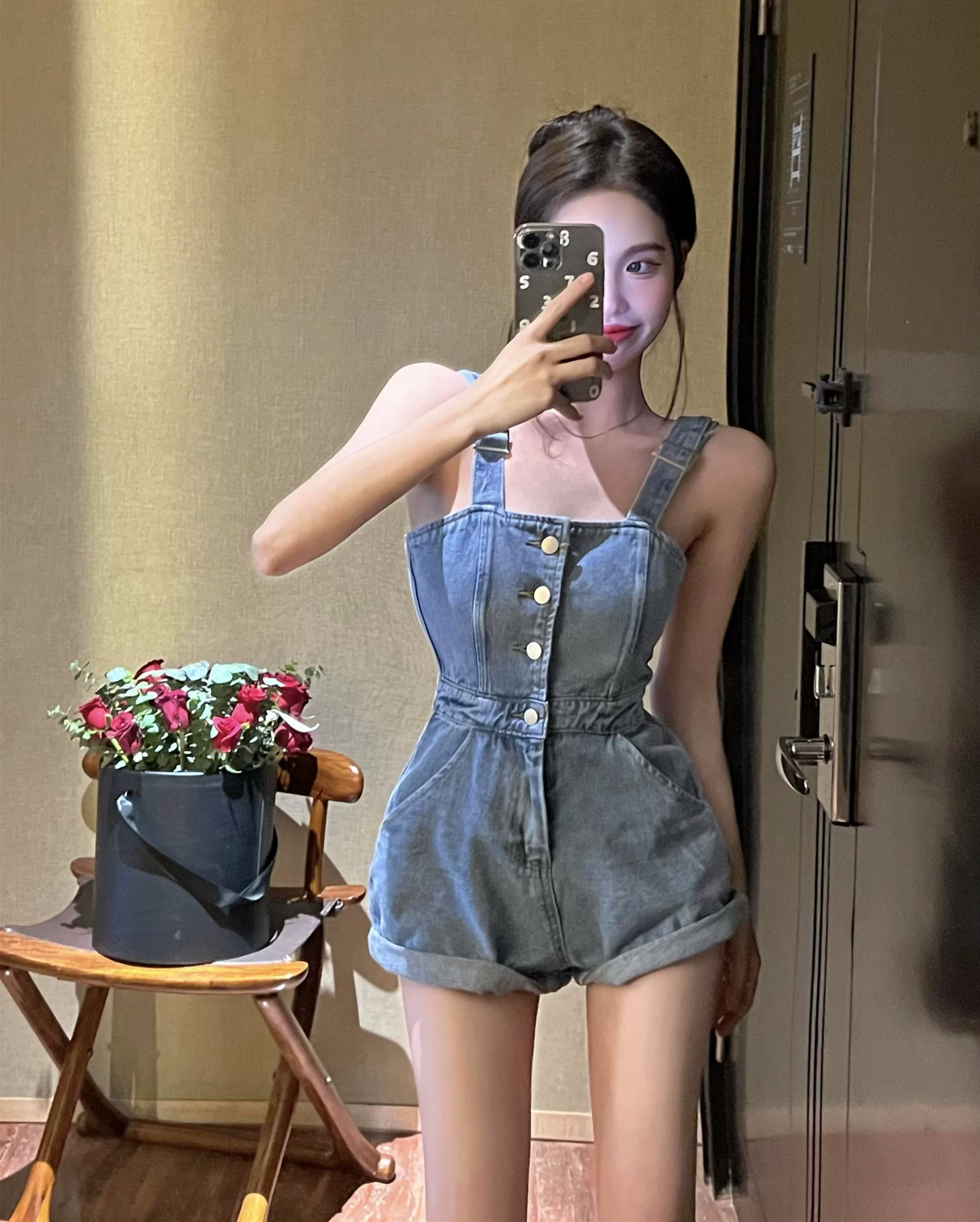 | nameOriginal | Summer age-reducing blue denim jumpsuit with high waist and buttons |