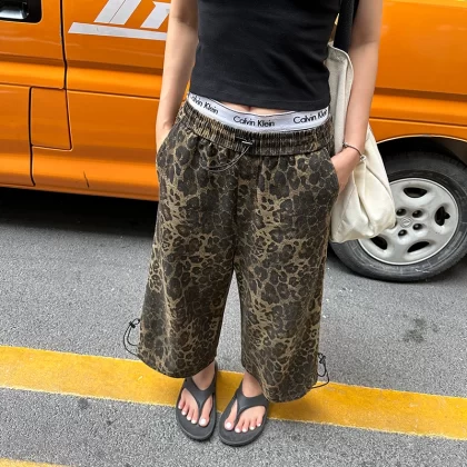Summer American Retro Leopard Print Cropped Distressed Jeans