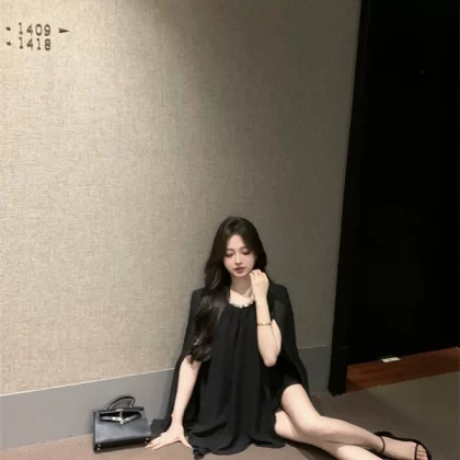 Summer black chiffon loose cape a-line skirt shoulder pads