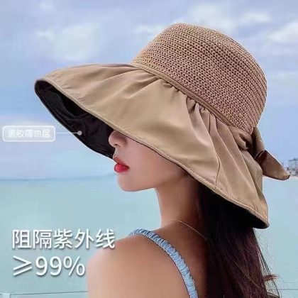 Summer Black Glue Bow Sun Hat Women’s Hollow Straw Hat Anti-ultraviolet Big Brim Face-shading Sun Fisherman Hat