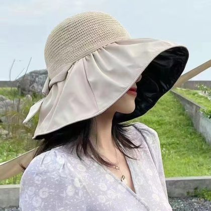 Summer Black Glue Bow Sun Hat Women's Hollow Straw Hat Anti-ultraviolet Big Brim Face-shading Sun Fisherman Hat