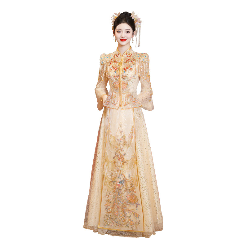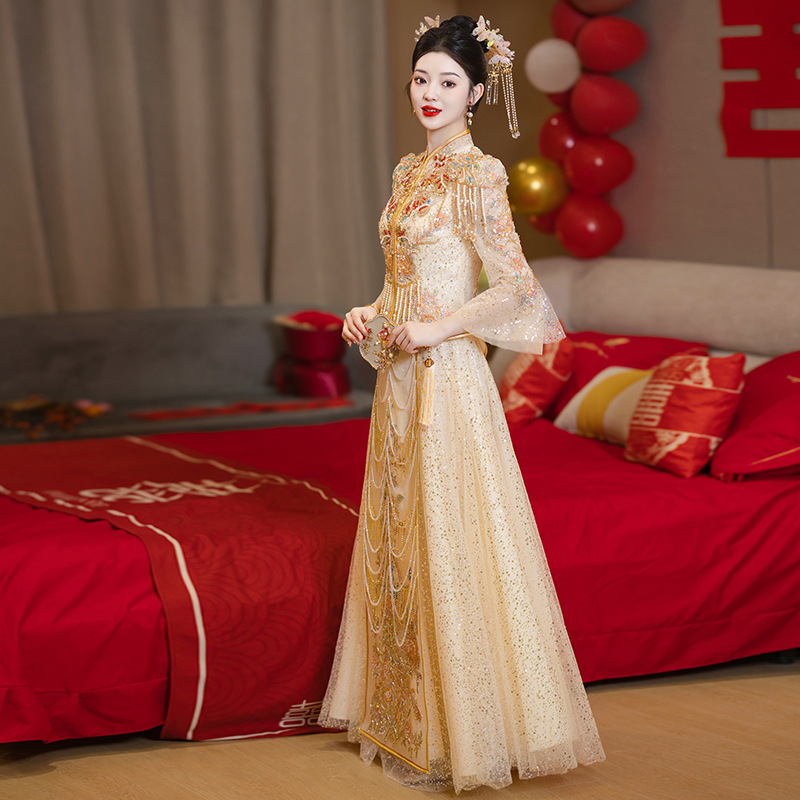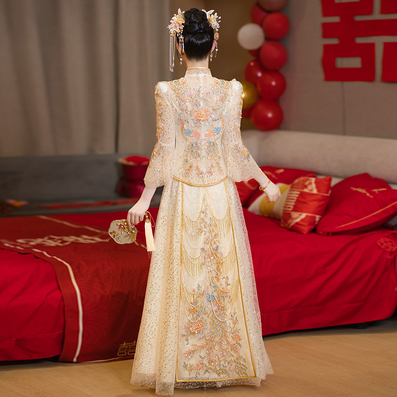 | nameOriginal | Summer Champagne Color Xiuhe Dress 2024 New Wedding Dress Heavy Industry Bride Chinese Wedding Dress Dragon and Phoenix Gown |