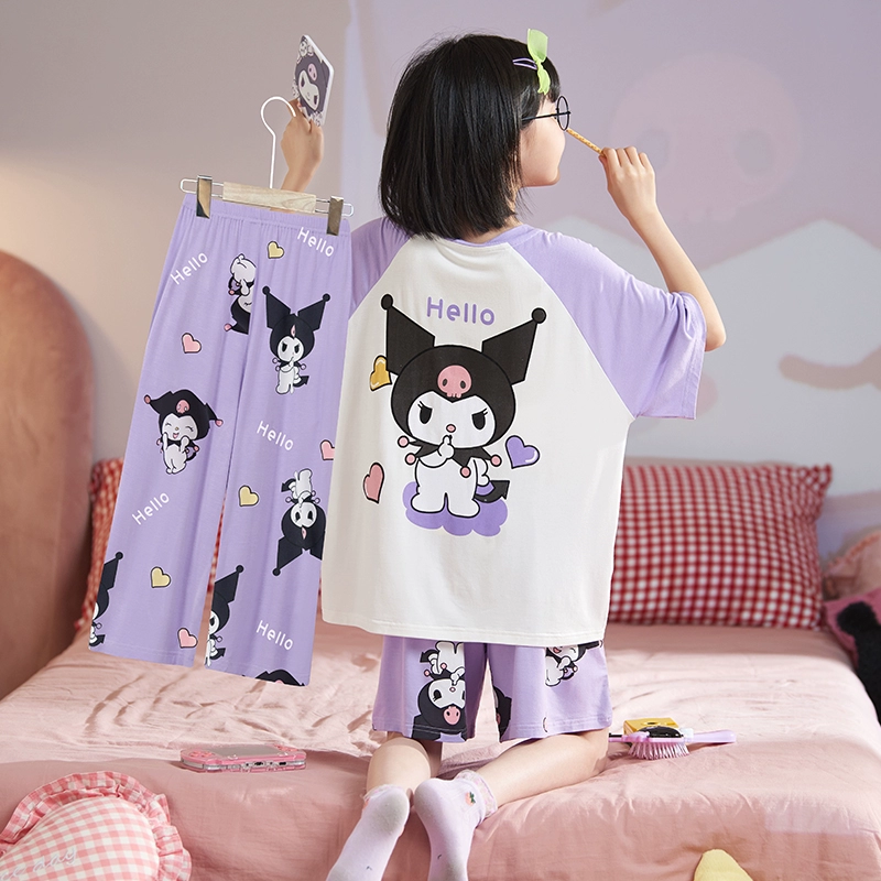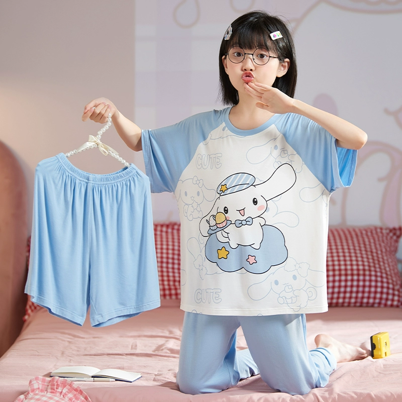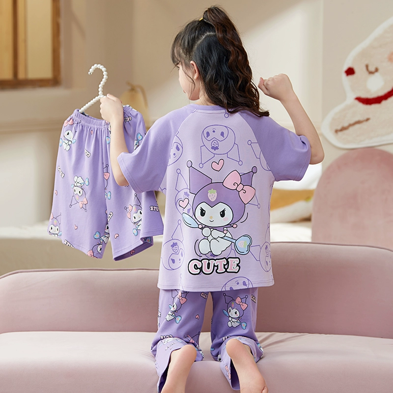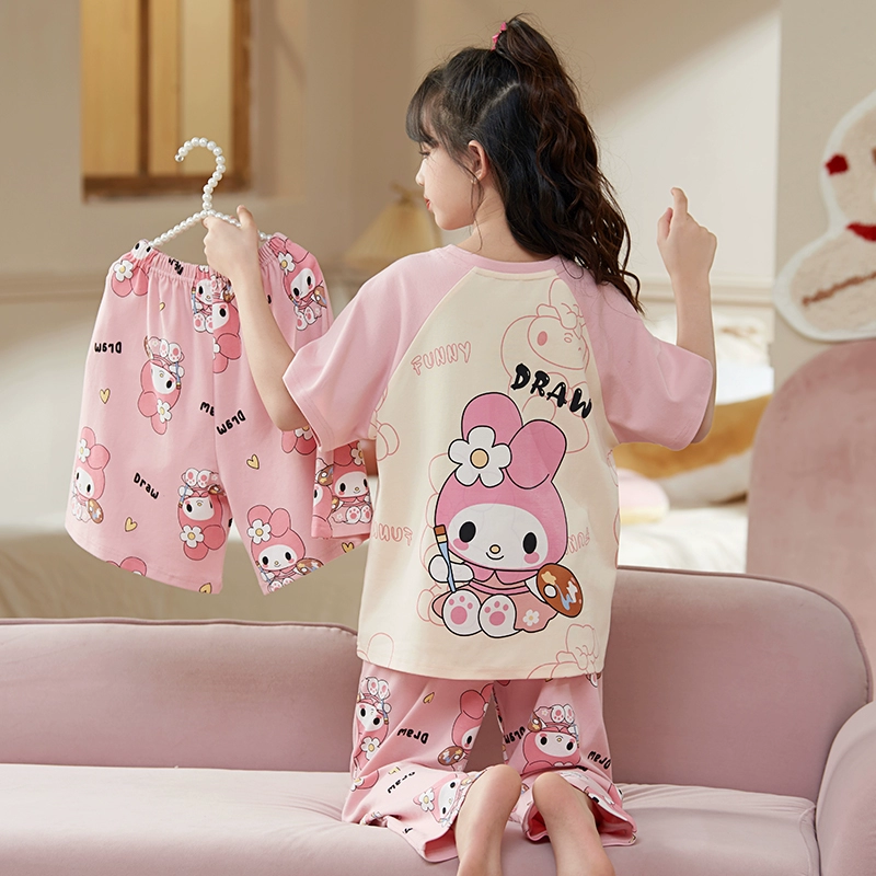 Summer children's pajamas pure cotton thin short-sleeved trousers three-piece suit Melody girls parent-child mother-daughter home clothes