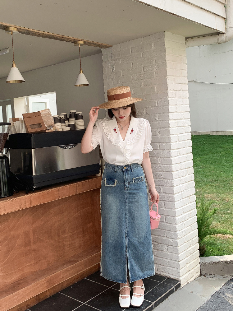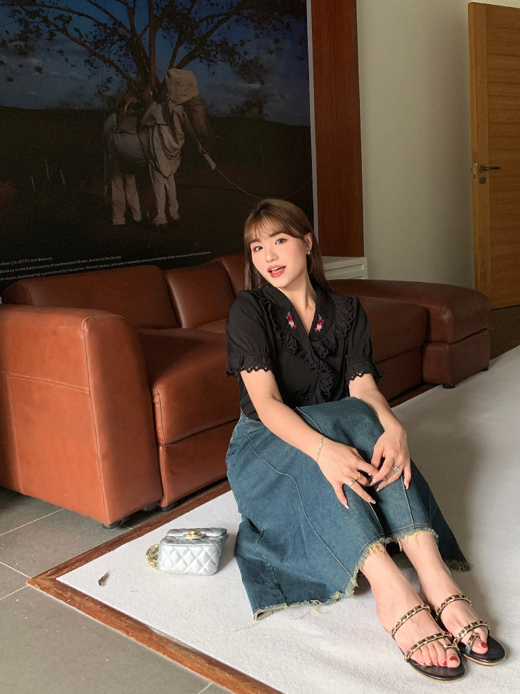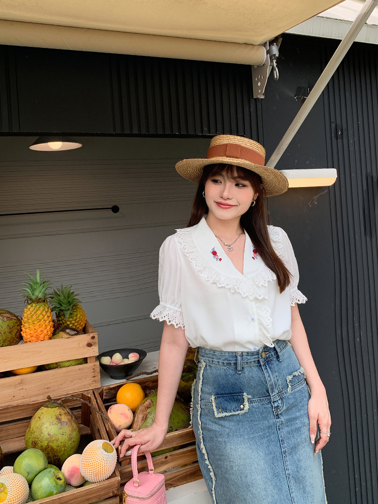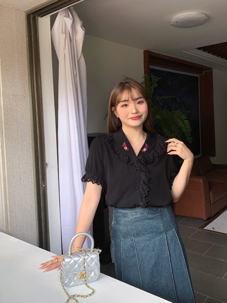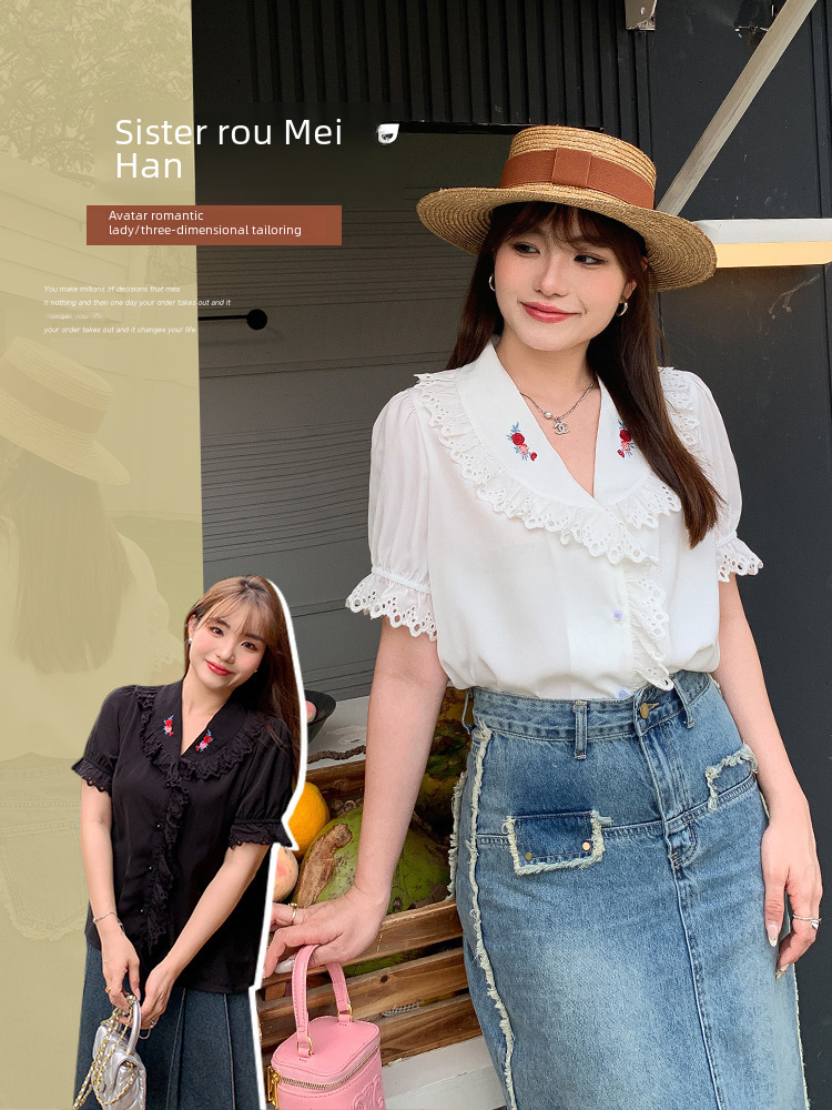 | nameOriginal | Summer chubby girl plus size women's clothing French retro V-neck embroidered ruffled short sleeve doll collar heavy work shirt 62508 |