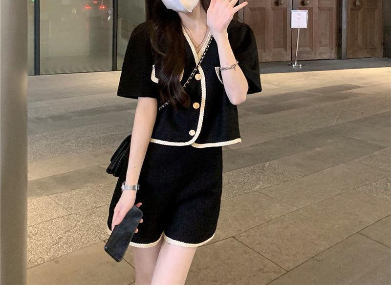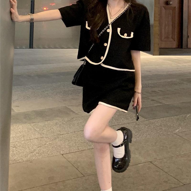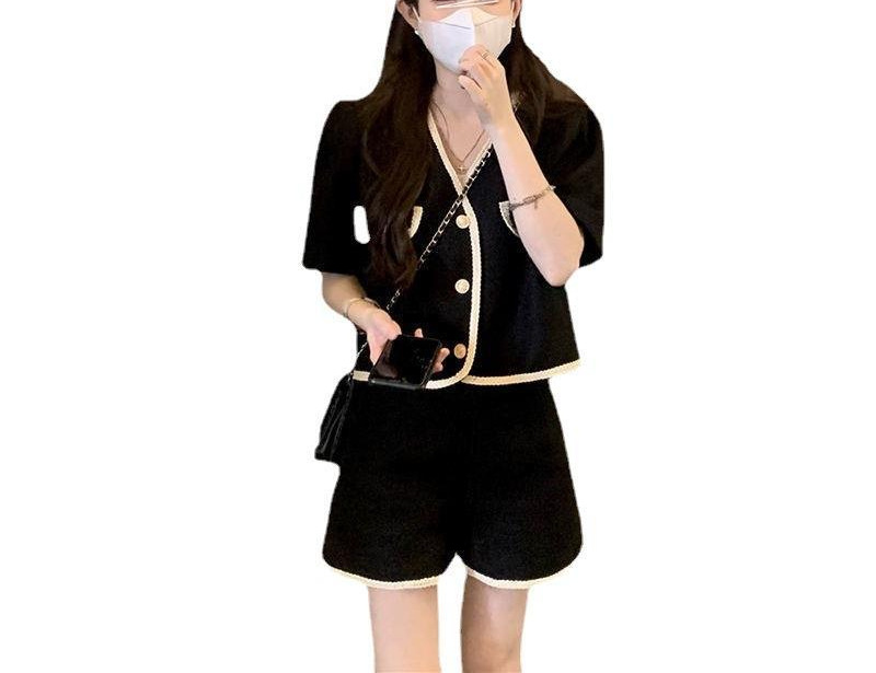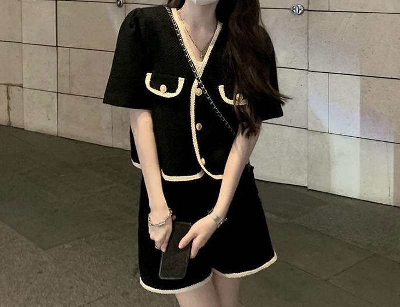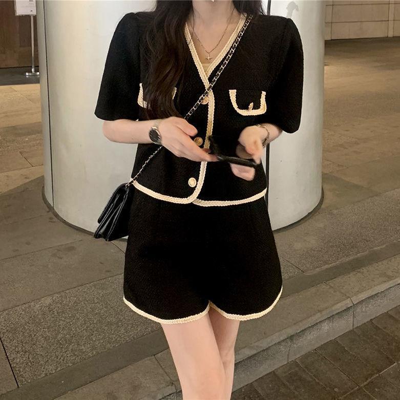 Summer clothing Chanel style women's clothing fashion suit 2023 new contrast color Western style short sleeve cardigan shorts top two-piece set