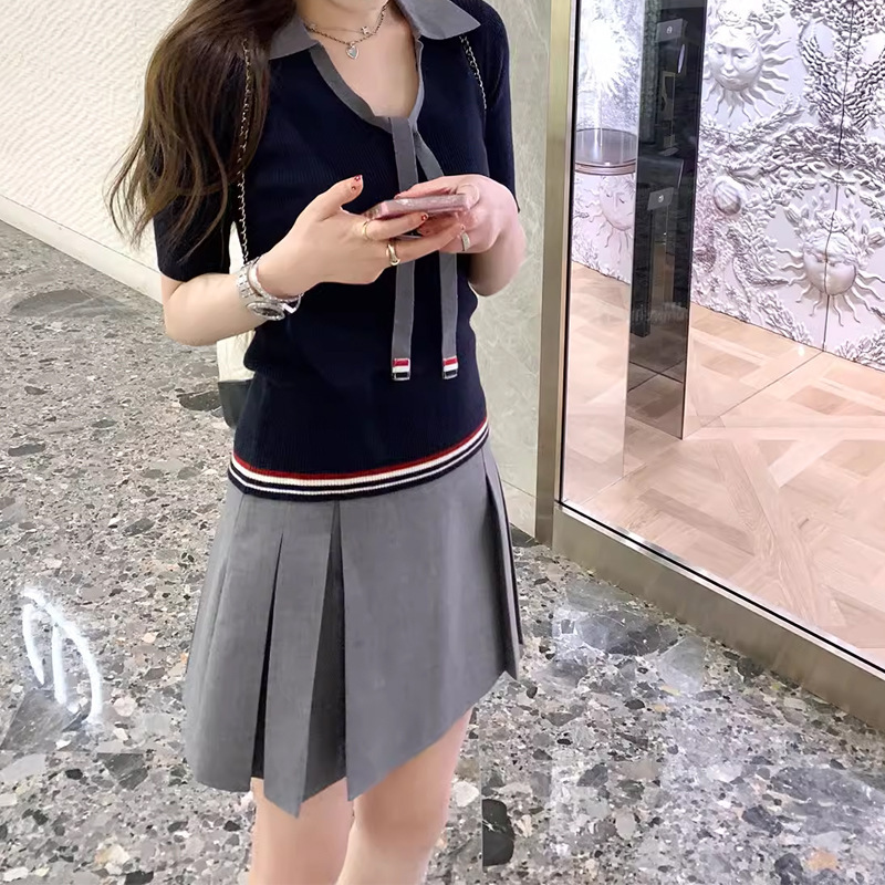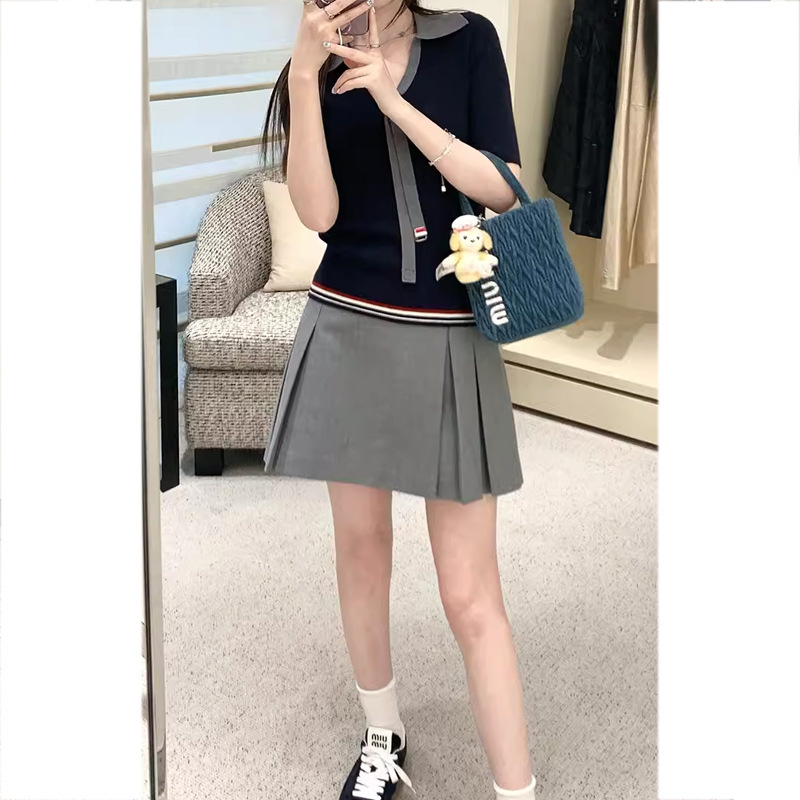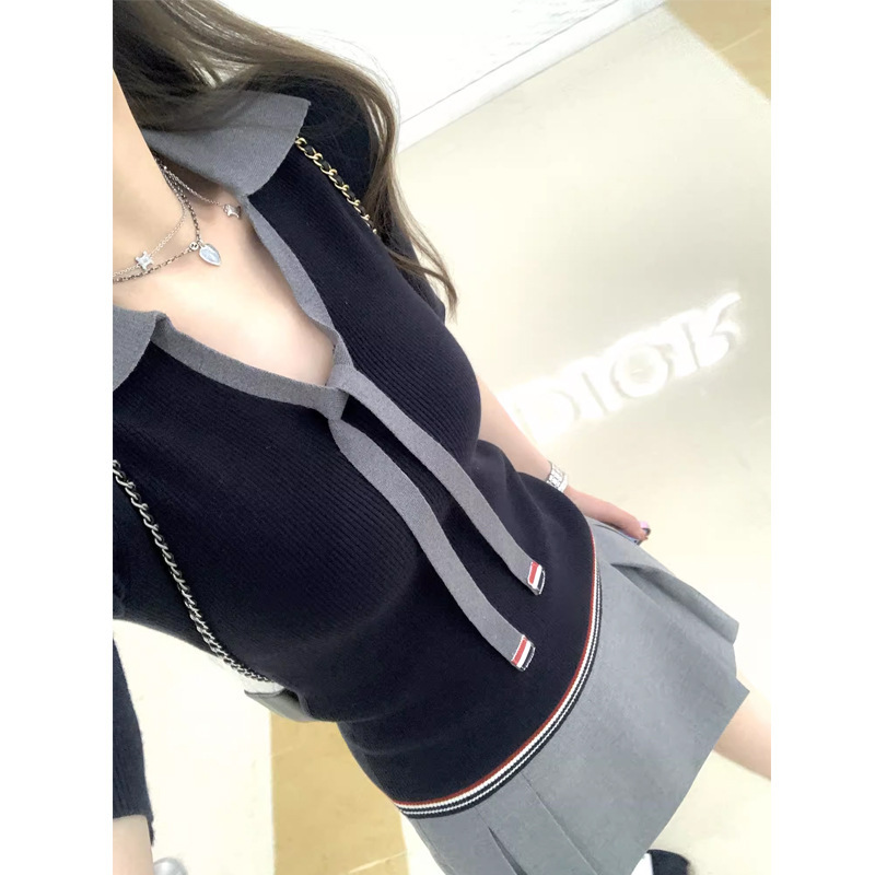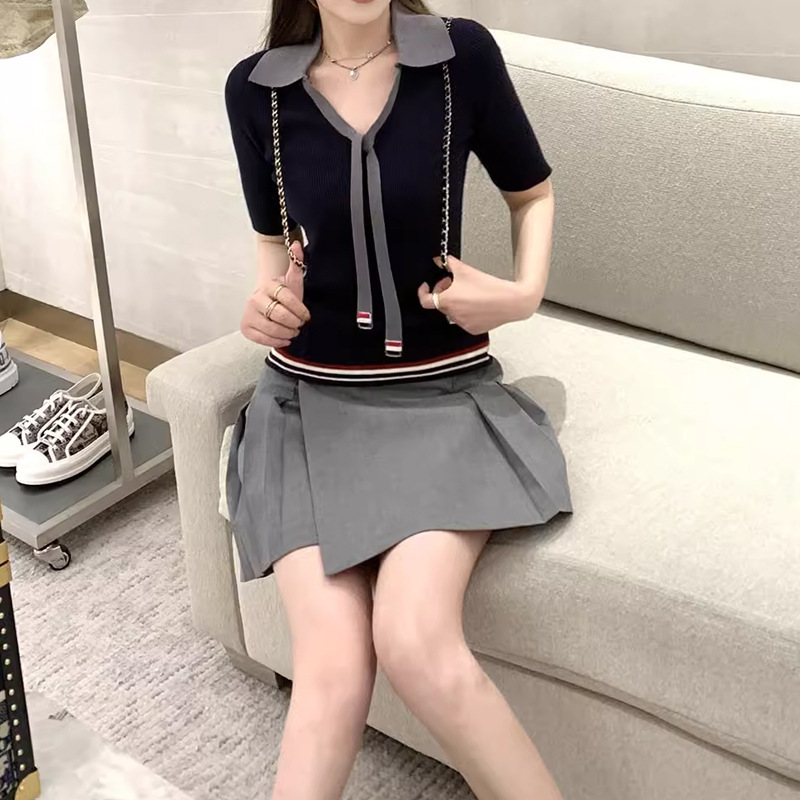 | nameOriginal | Summer College-style Age-reducing V-neck Ribbon Striped Contrast Short-sleeved Sweater Women's All-match Short Top Ins |