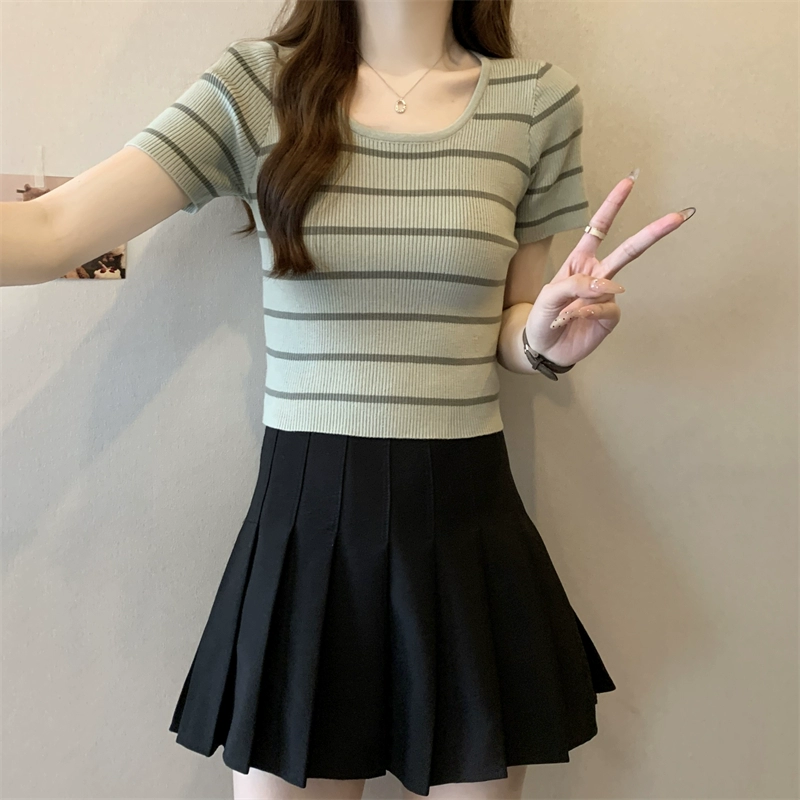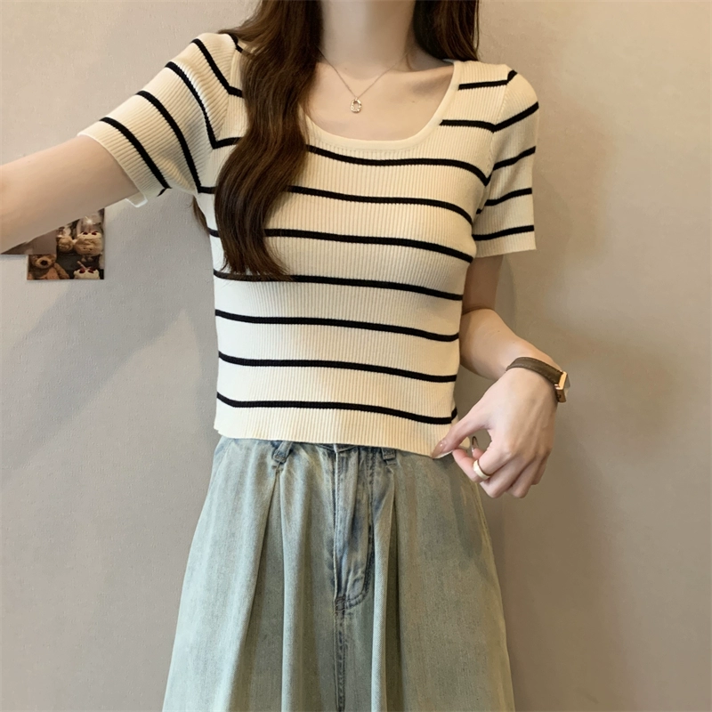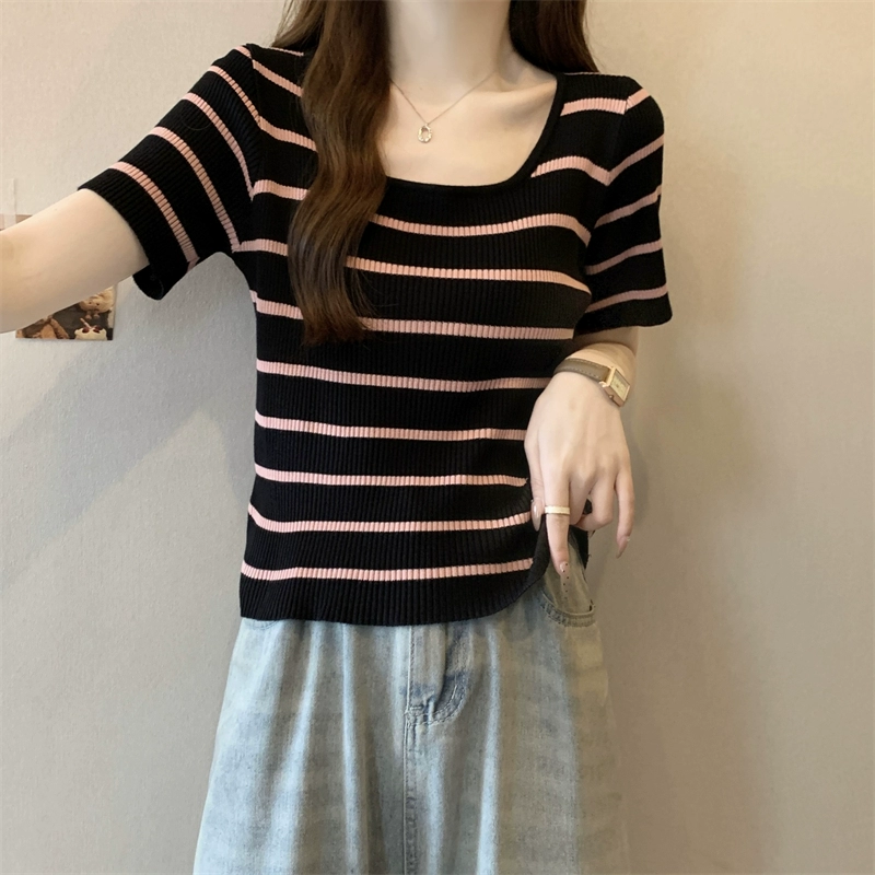 | nameOriginal | Summer Contrast Color Striped Top U Neck Right Shoulder T-Shirt Short Sleeve |