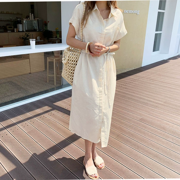 | nameOriginal | Summer cotton and linen long shirt dress lapel new cotton and linen Korean style loose single-breasted waist-cinching short-sleeved dress |