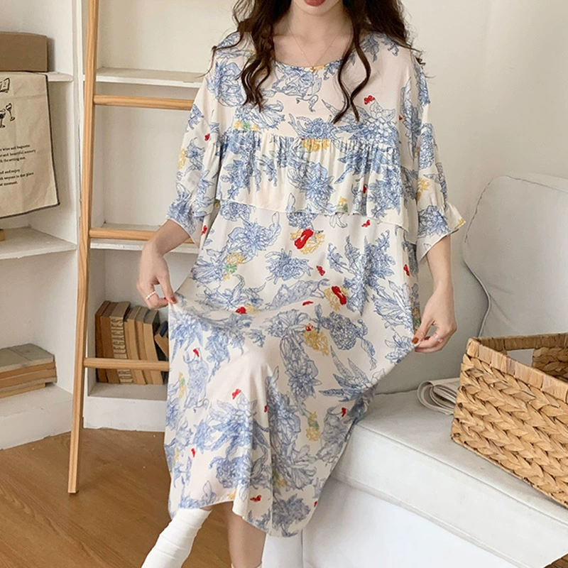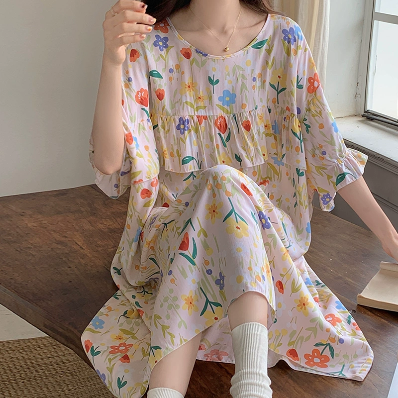 | nameOriginal | Summer cotton silk nightgown for women, anti-bump extra large size, sweet round neck printed cotton silk skirt, can be worn as home wear long skirt |