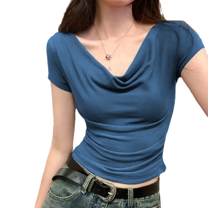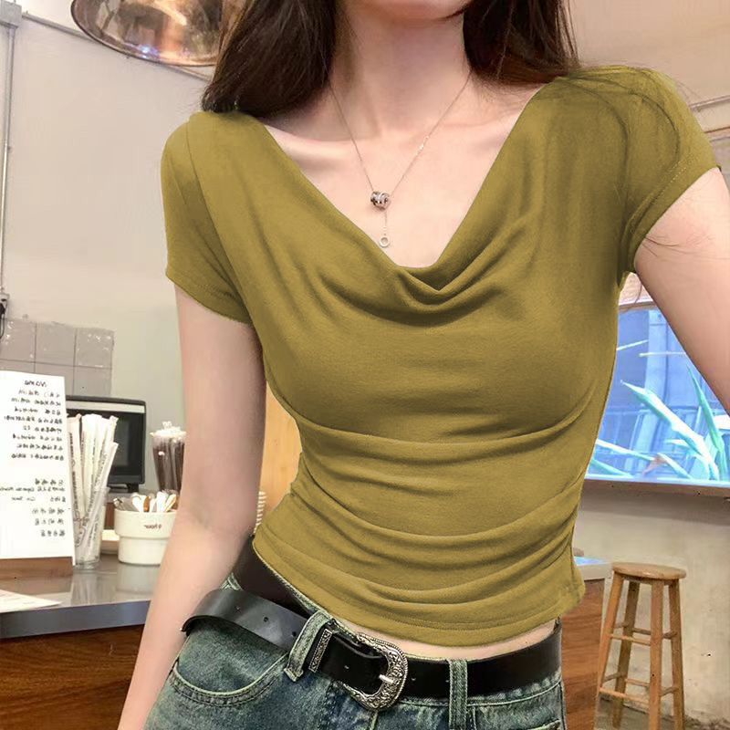 | nameOriginal | Summer Cross Swing Collar Top Short-sleeved Fashionable V-neck Design Pleated Base Shirt Women's All-match Simple T-shirt |