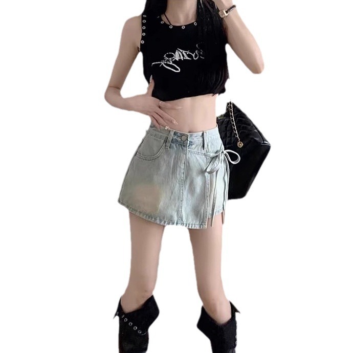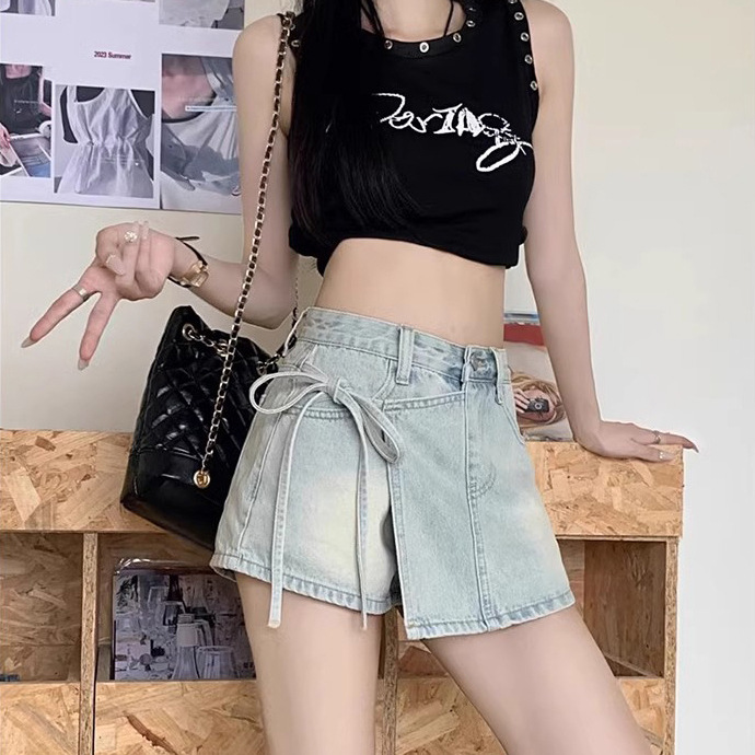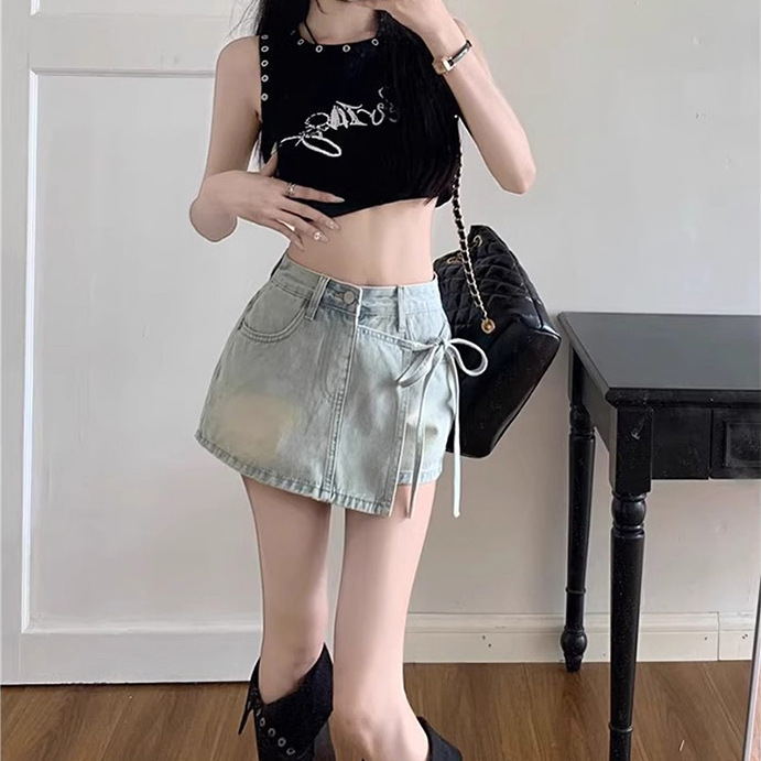 | nameOriginal | Summer Design Sense A- shape High Waist Irregular Fake Two-piece Denim Shorts Women's Strap Culottes |