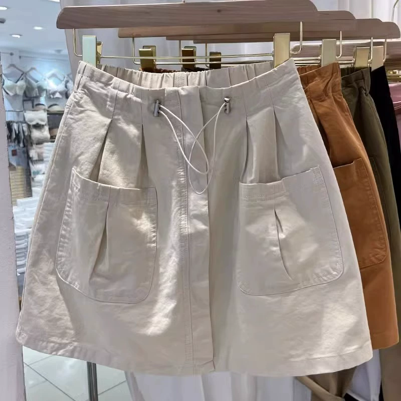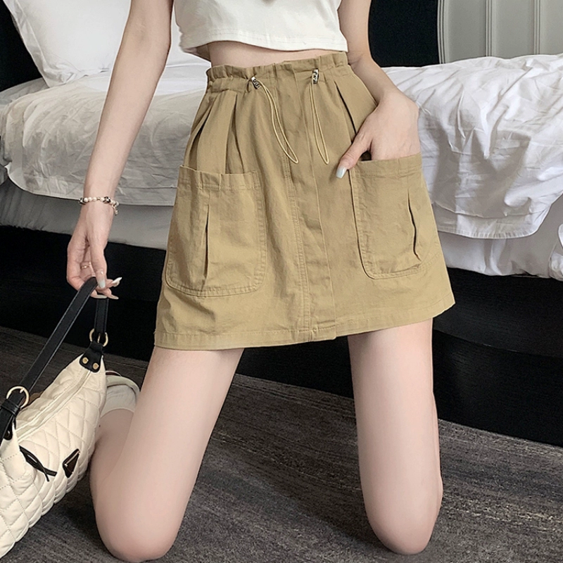 Summer elastic high waist drawstring large pocket work skirt