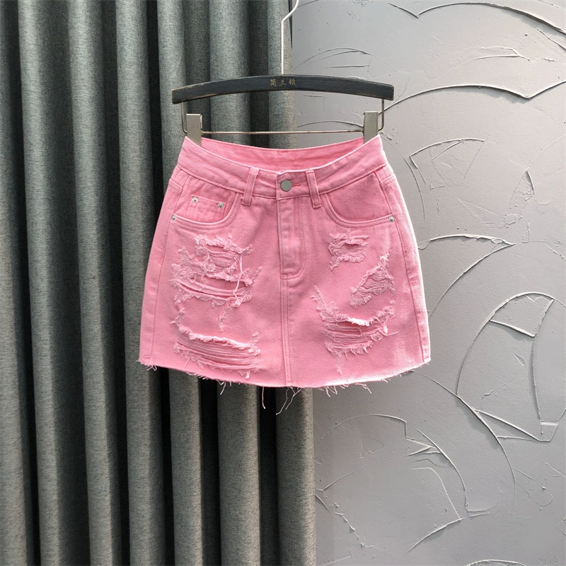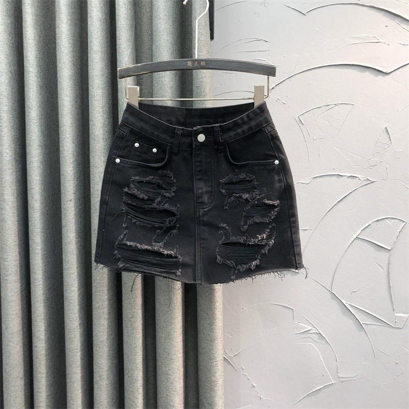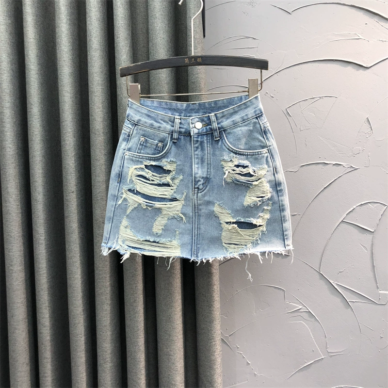 Summer European style personalized ripped and versatile denim skirt