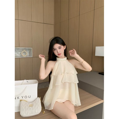 | nameOriginal | Summer French style apricot ruffled sleeveless pearl halter neck |