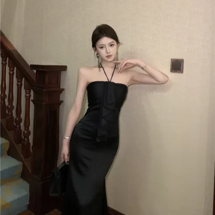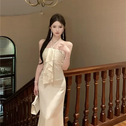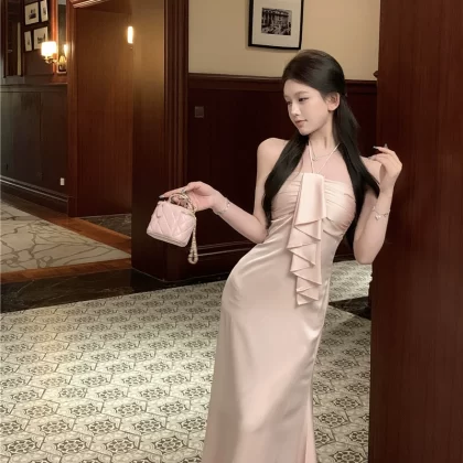 | nameOriginal | Summer French style exquisite satin backless halter dress |