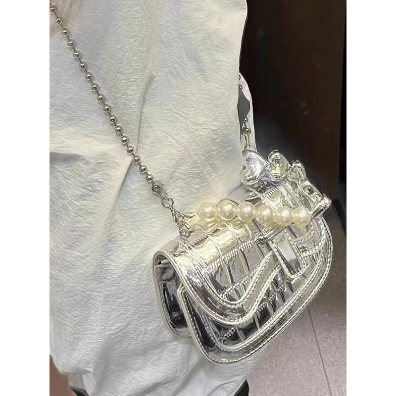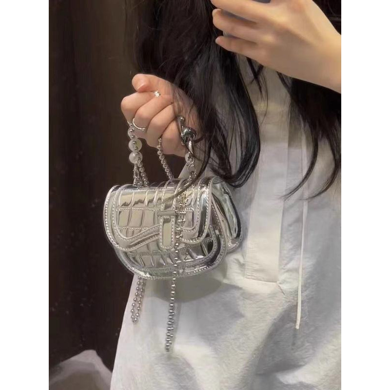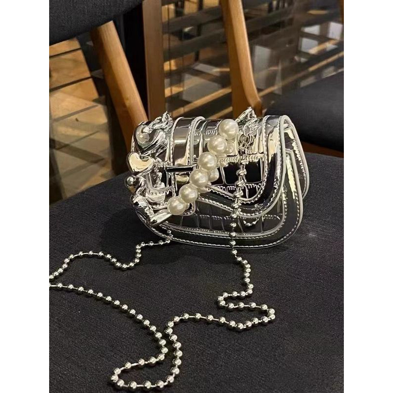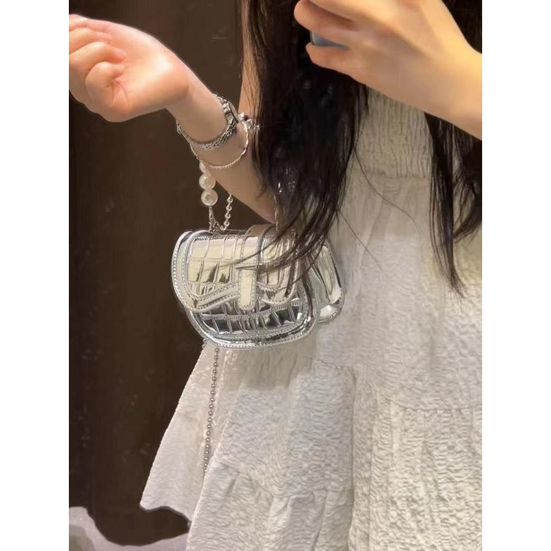 Summer High-end Niche Texture Pearl Chain Crosbody Mini Silver Small Bag Girls 2024 New Waist Bag