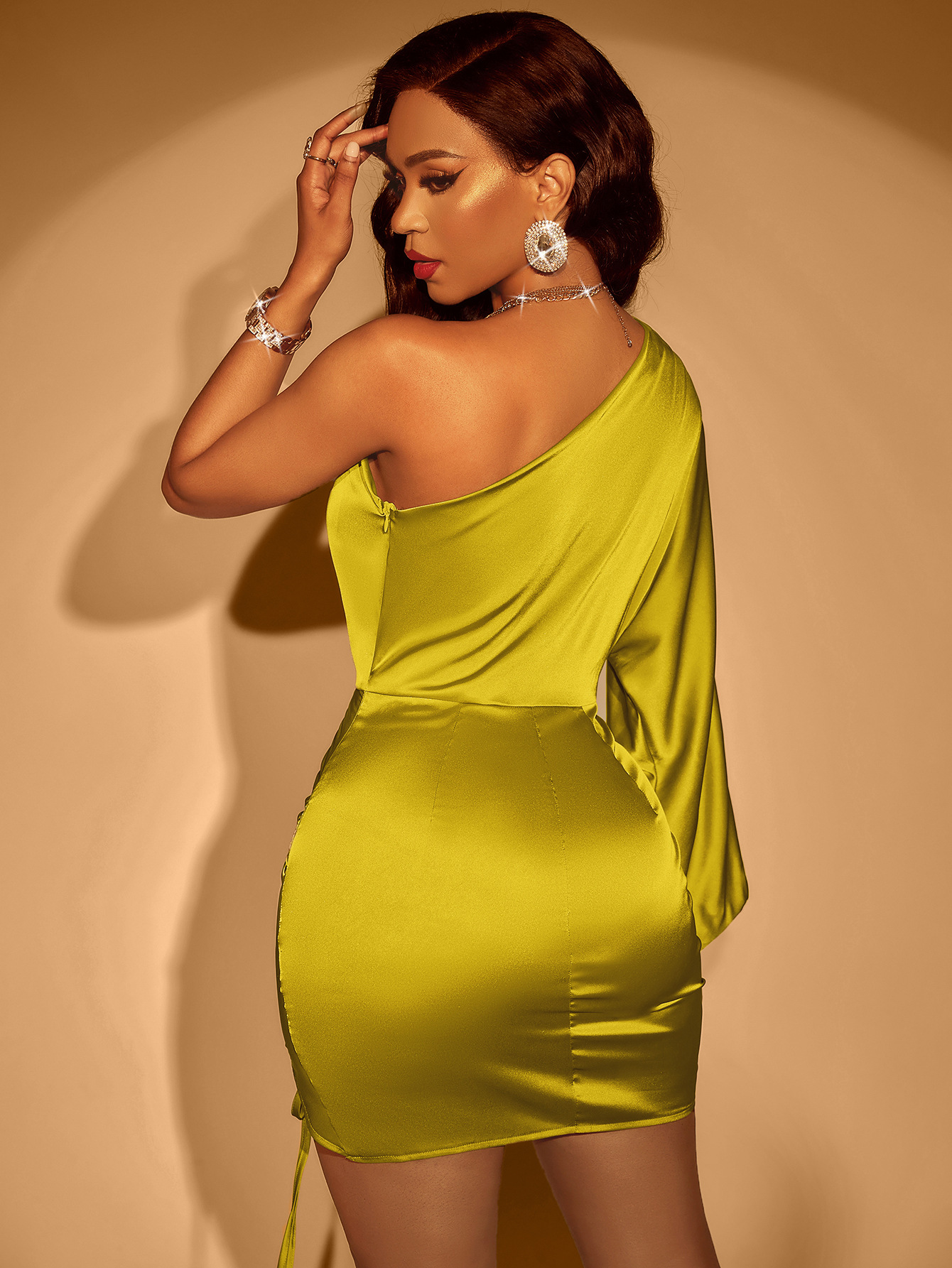 | nameOriginal | Summer hot sexy style women's clothing European and American Amazon new solid color one-shoulder pleated hip drawstring dress |
