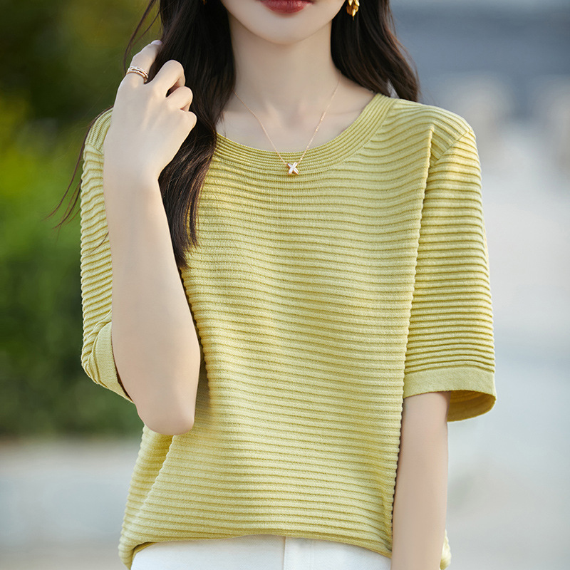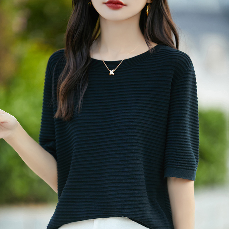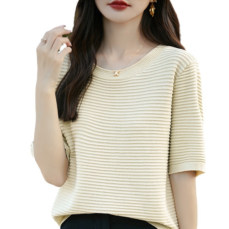 | nameOriginal | Summer Ice Silk Knitted Short-sleeved T-shirt Women's 2024 Summer Thin Round Neck Loose Texture Casual Top T-shirt |