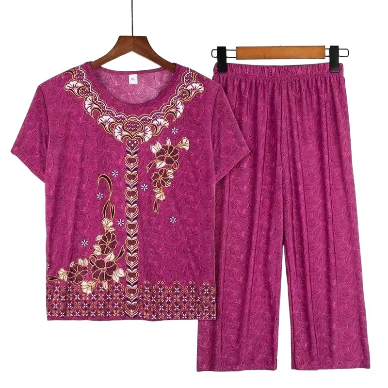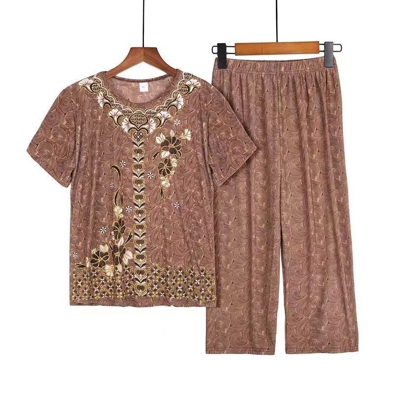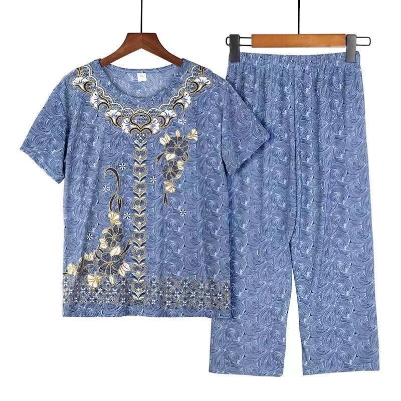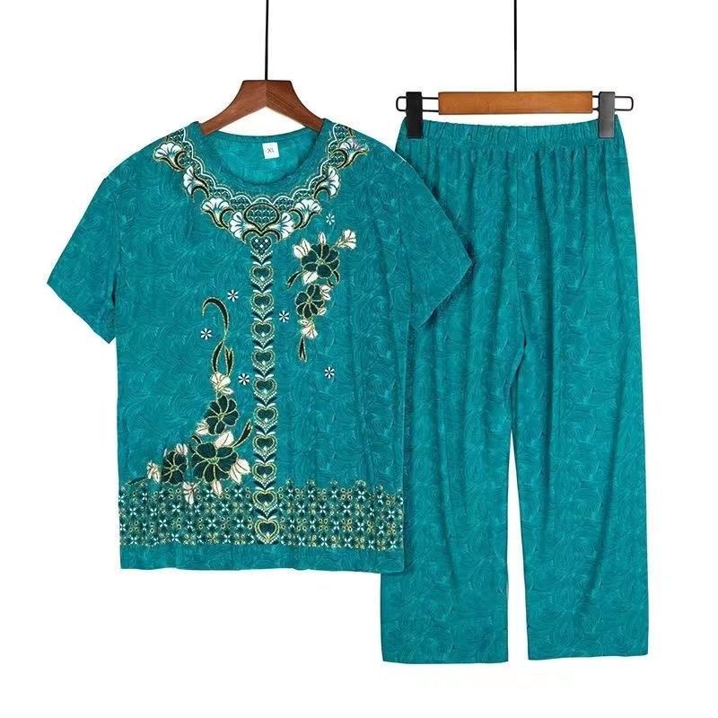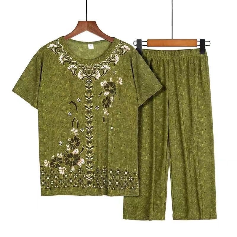 Summer Ice Silk Short-sleeved Mother Dress Large Size Casual Loose Western Style Two-piece Suit Top Pants Elderly Clothes