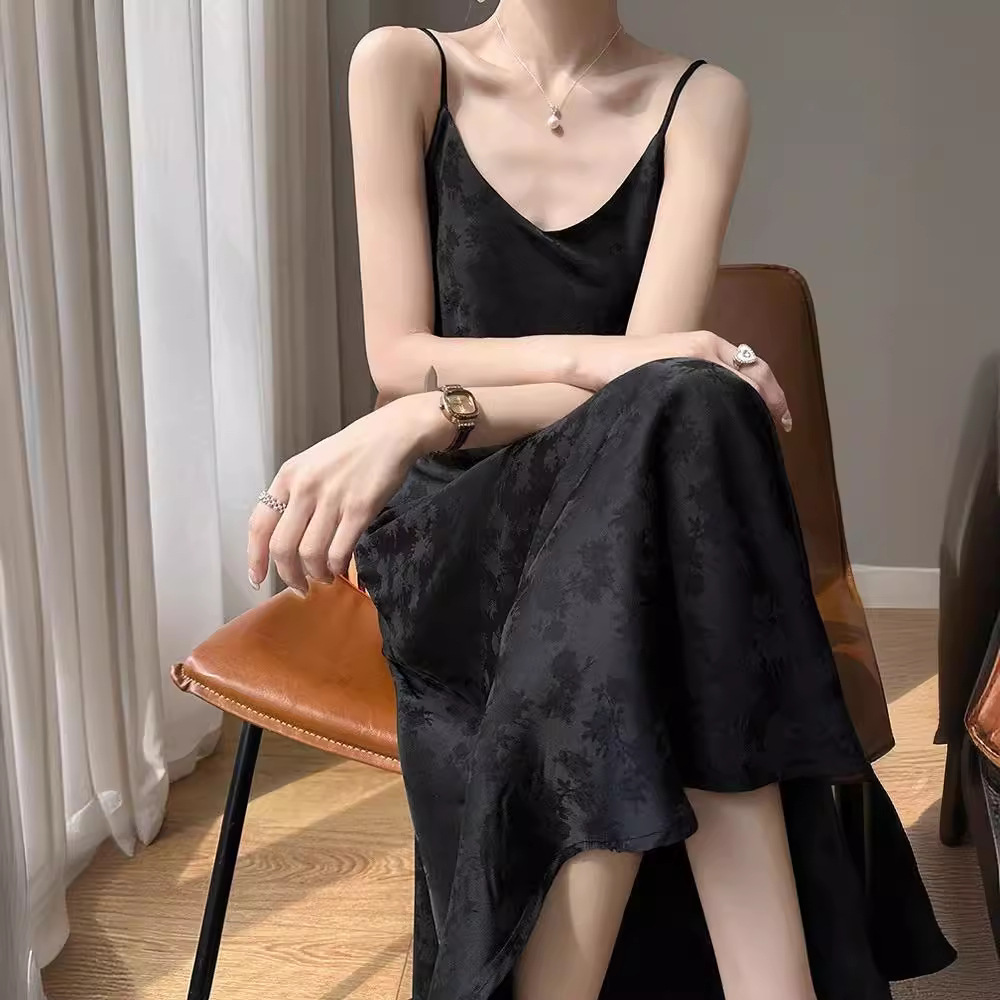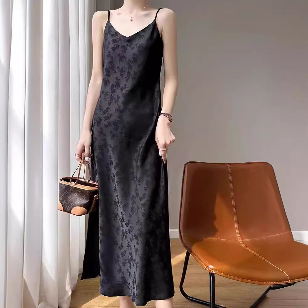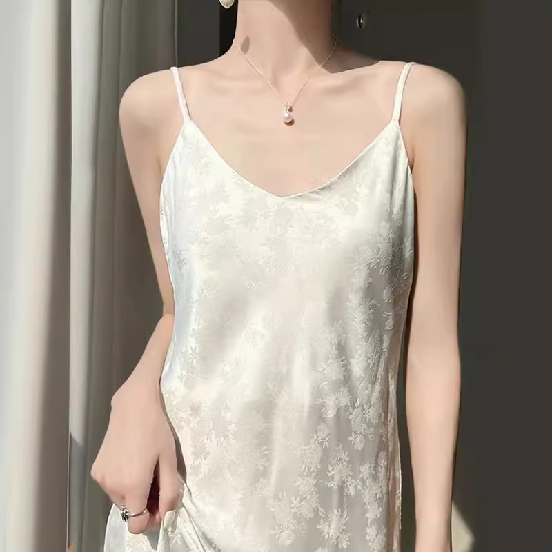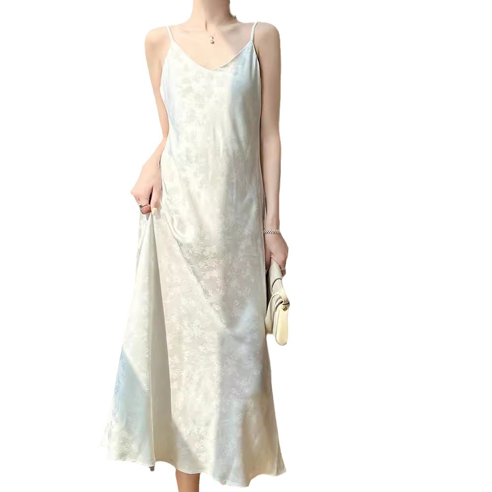 | nameOriginal | Summer Jacquard V-neck Sling dress Women's Acetic Acid Satin Over-the-Knee A- line Long Dress Slimming National Style Base Dress |