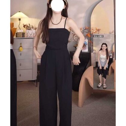 Summer small jumpsuit casual and versatile waist-hugging high strap jumpsuit wide-leg pants suspender jumpsuit set