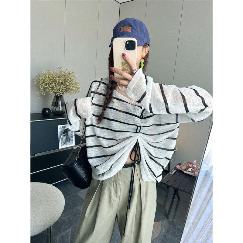 | nameOriginal | Summer Knitted Sunscreen Clothing Long-sleeved T-shirt Women's Spring 2024 New Loose Casual All-match Striped Short Trendy Top |